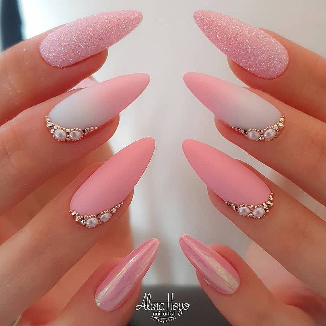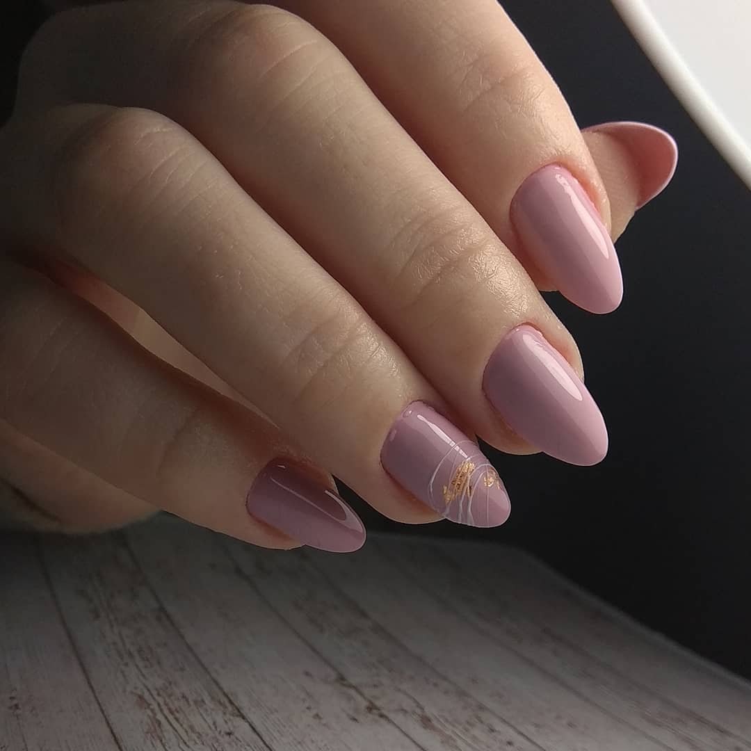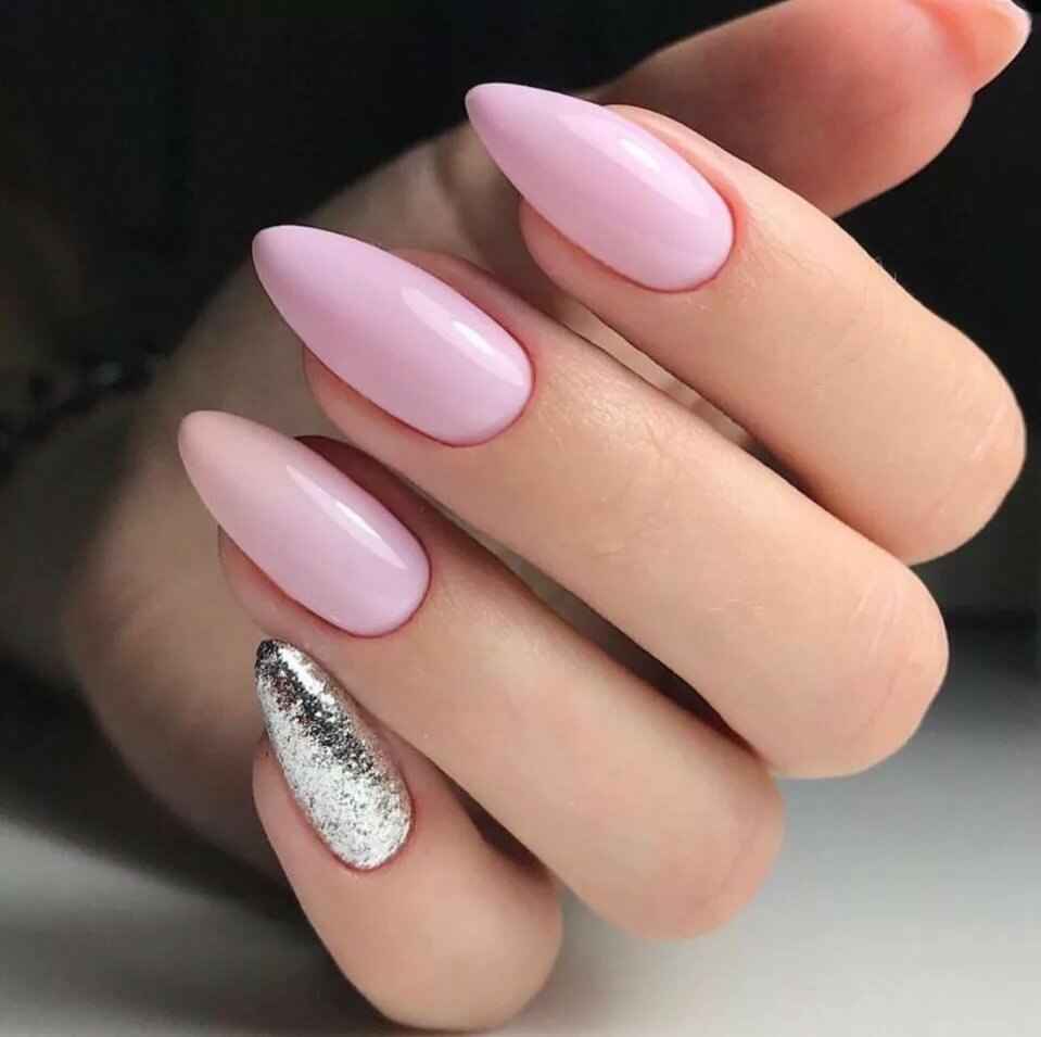 Розовый маникюр на миндалевидных ногтях