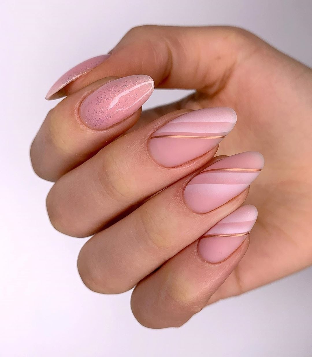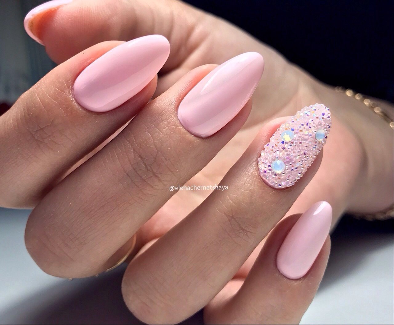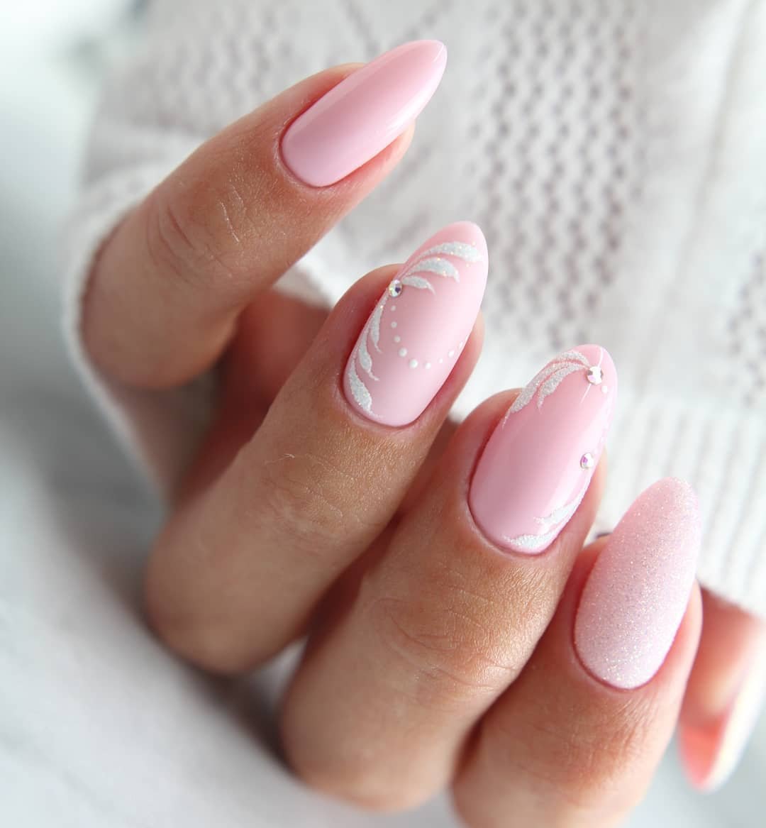 Розовый маникюр на миндалевидных ногтях