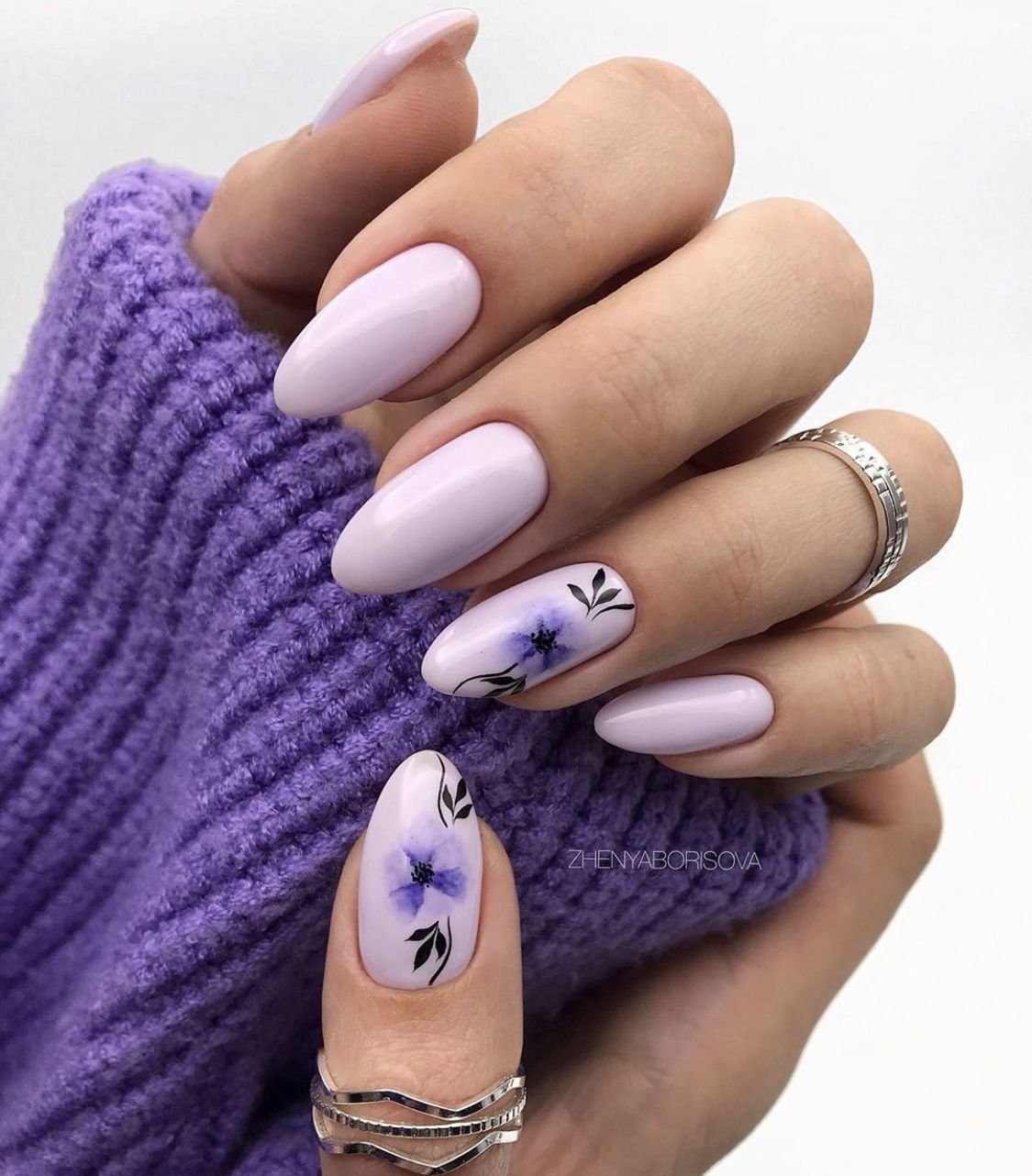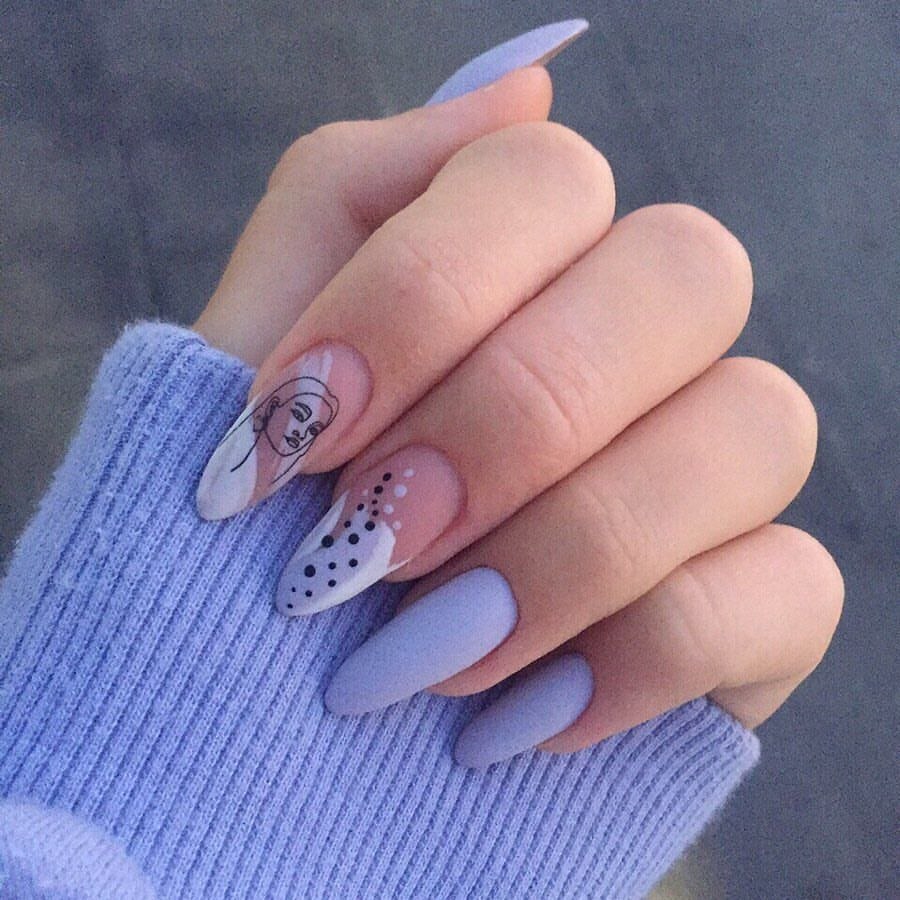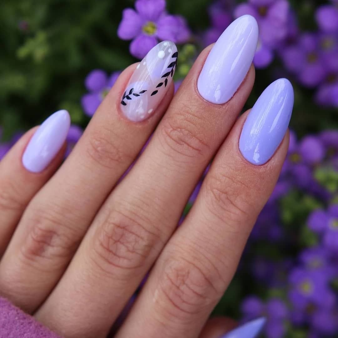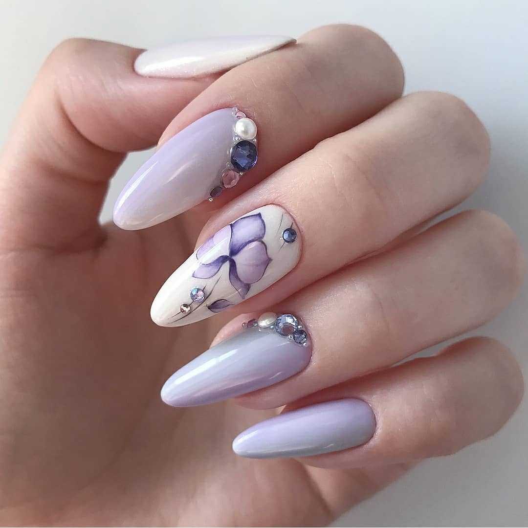 Маникюр на миндальные ногти лавандовый с белым
