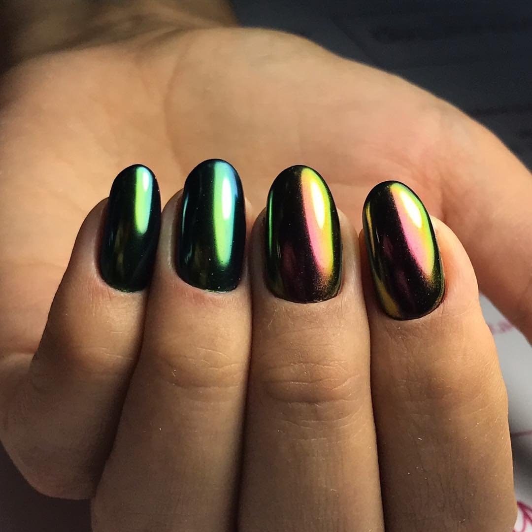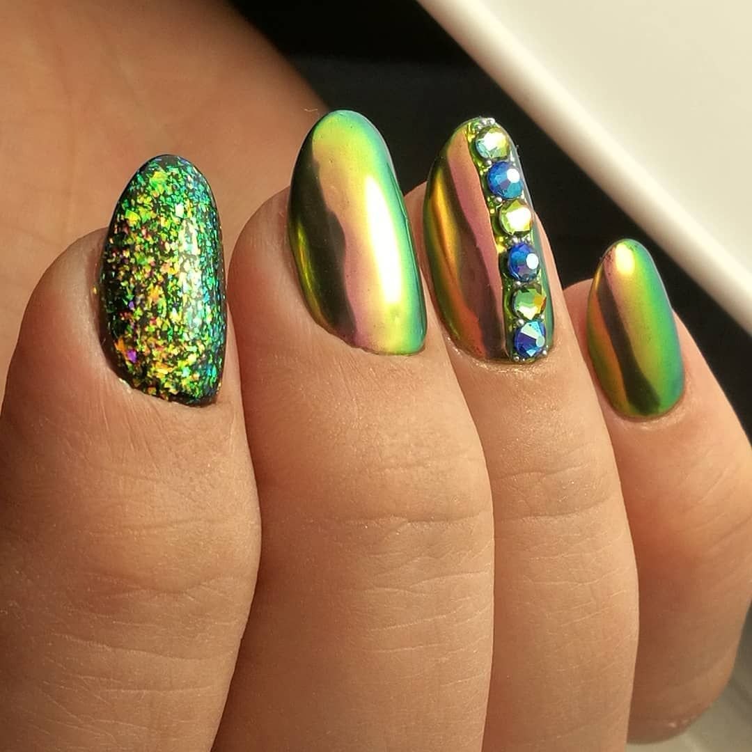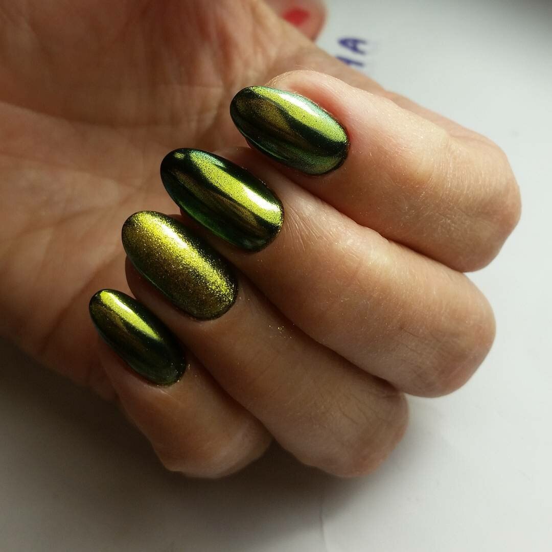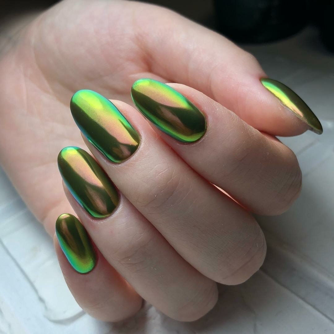 Зеркальный зелёный маникюр