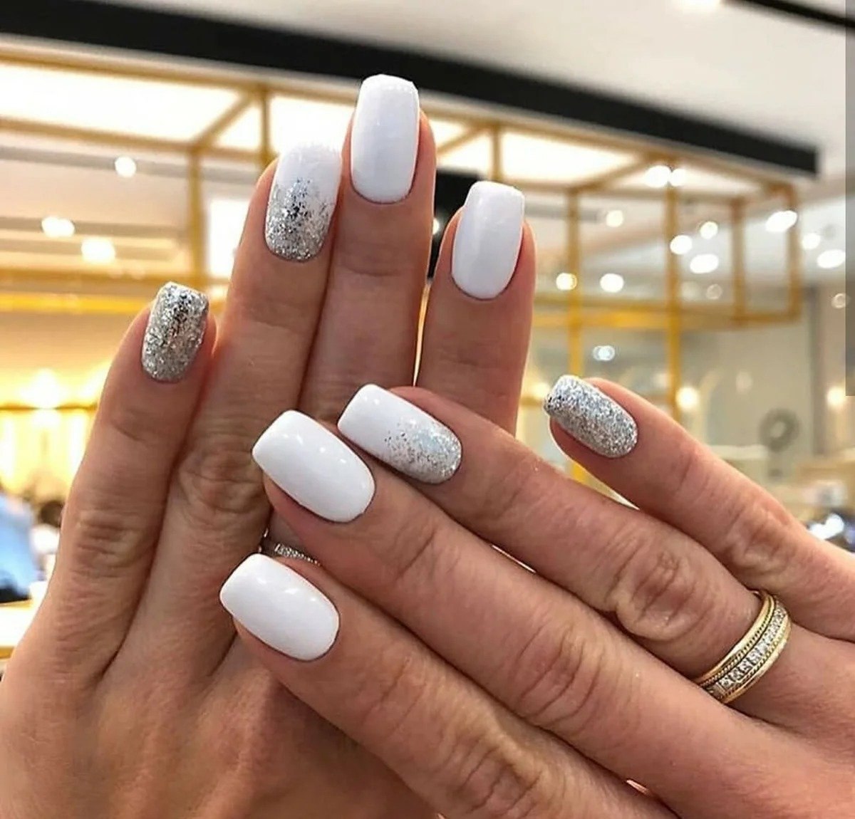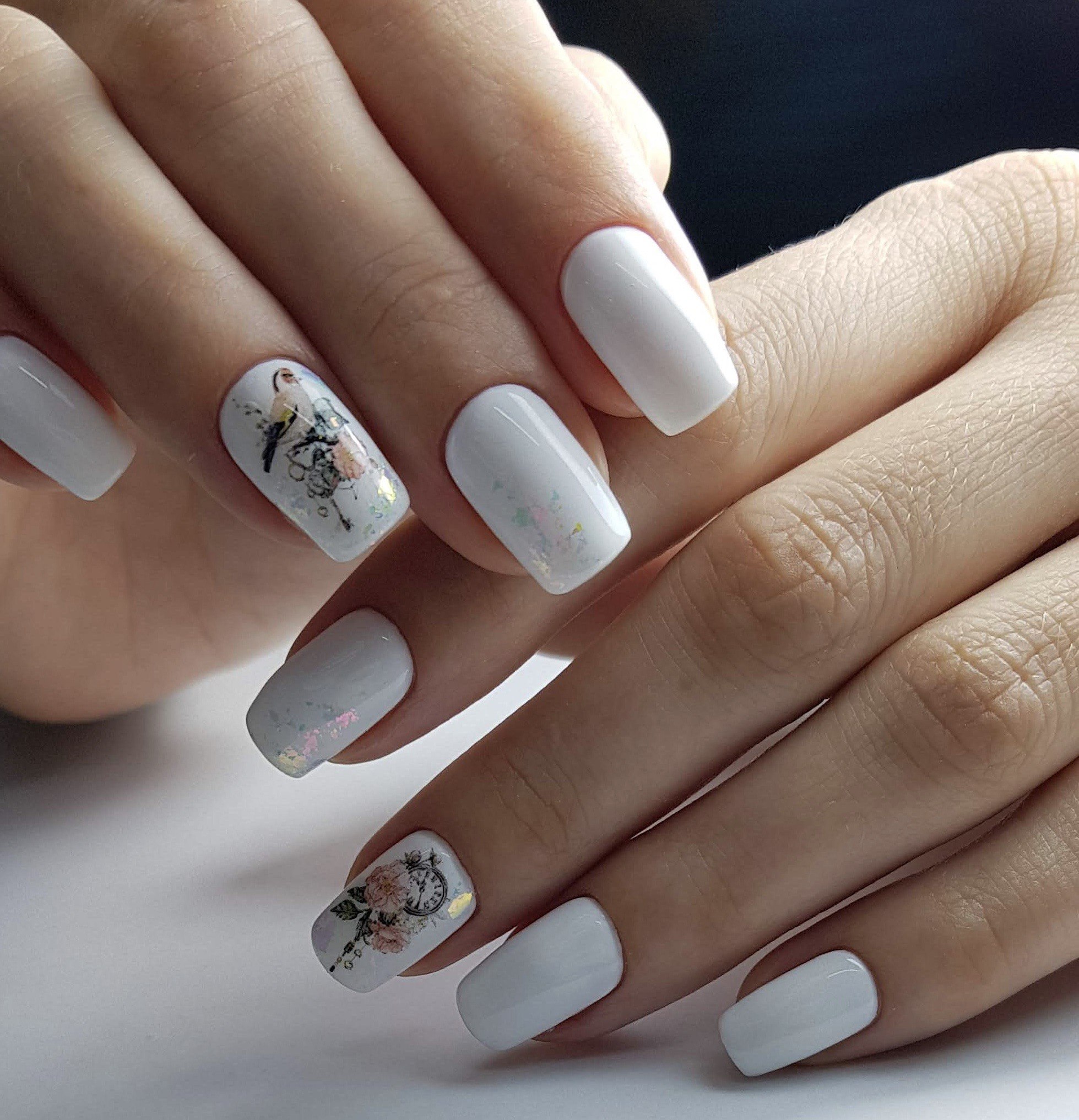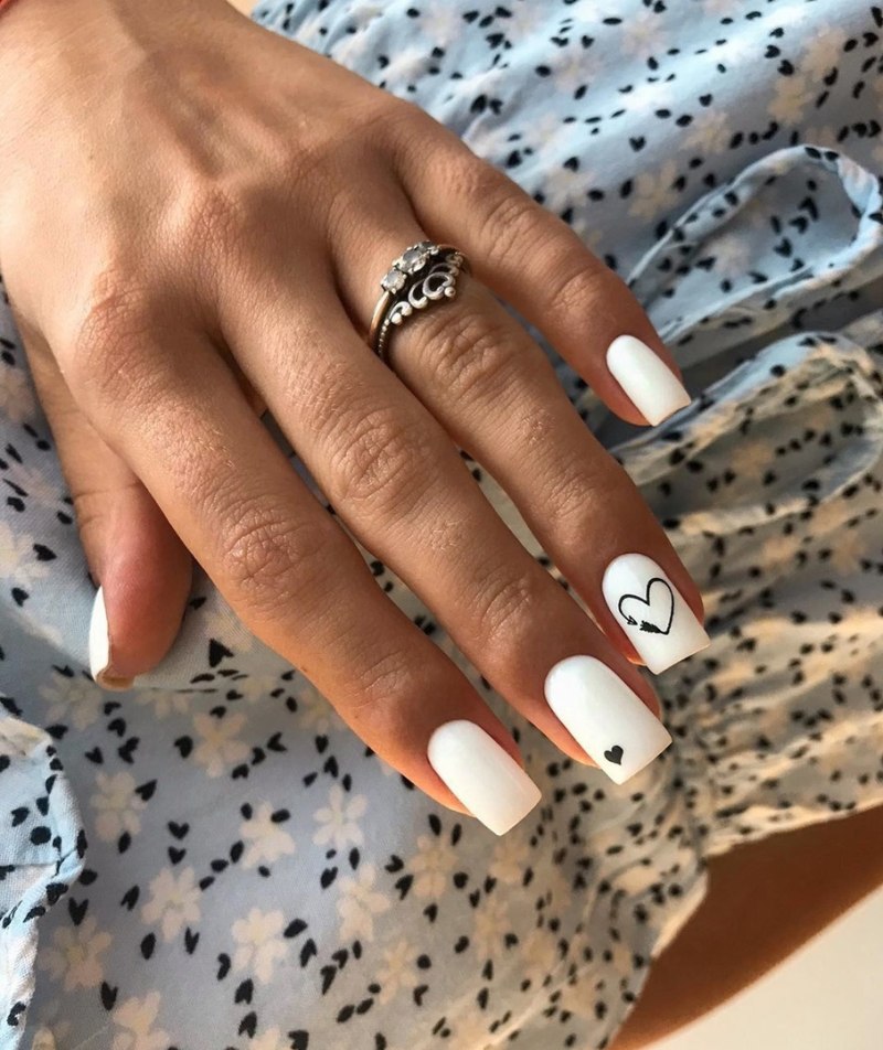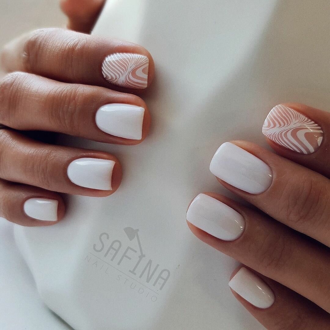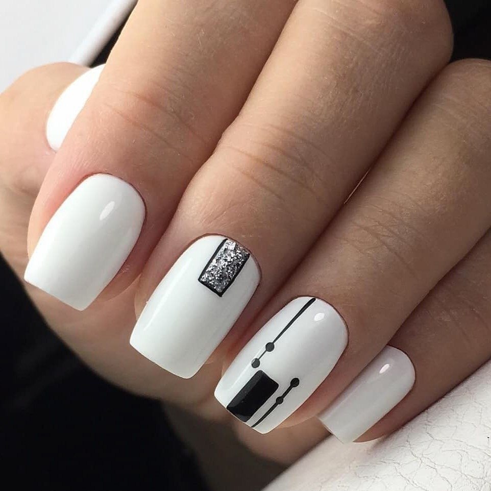 Белый маникюр с дизайном на квадратные