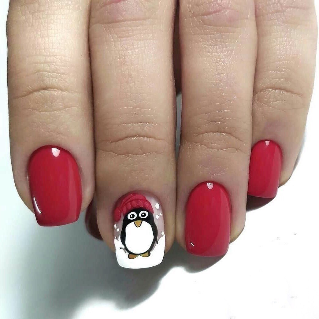 Новогодний маникюр с пингвином на короткие ногти