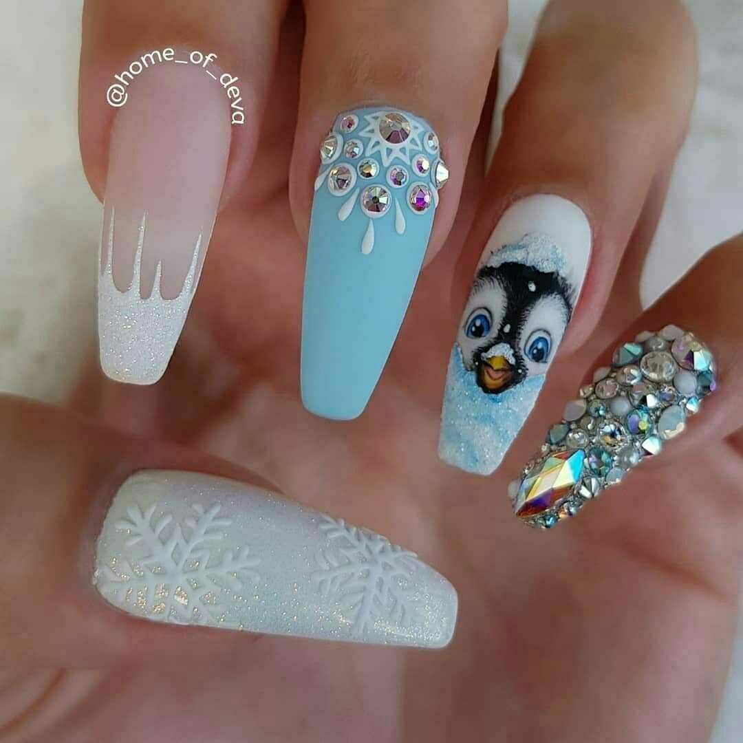 Маникюр на длинные ногти с пингвином