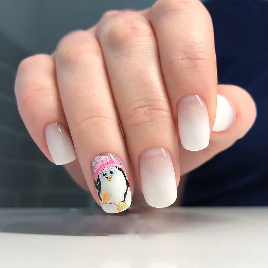Белый маникюр с пингвином