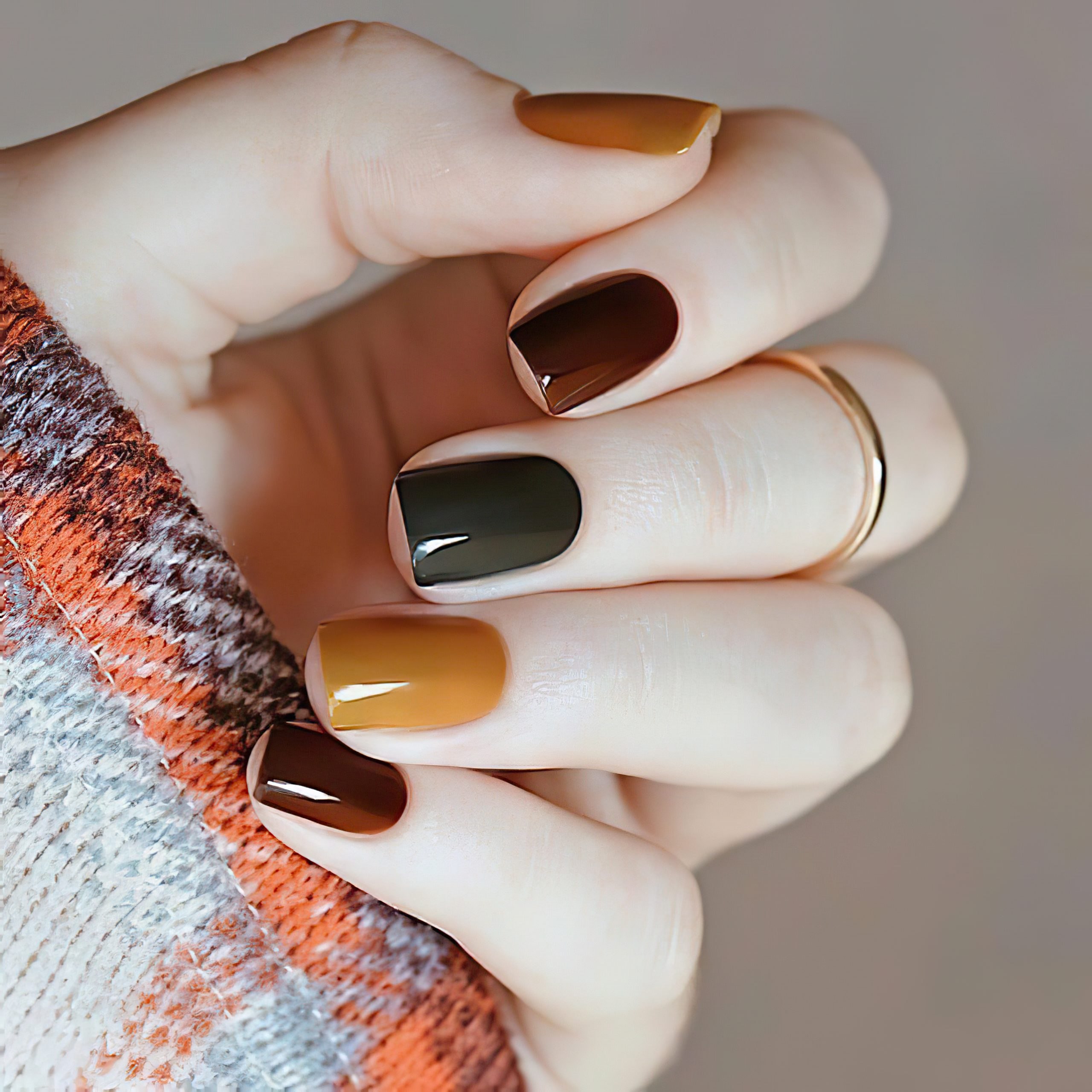 Маникюр коричневый с оранжевым желтым