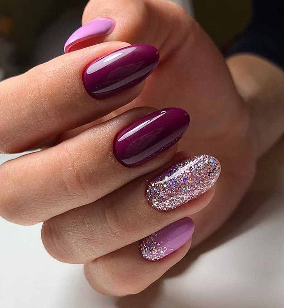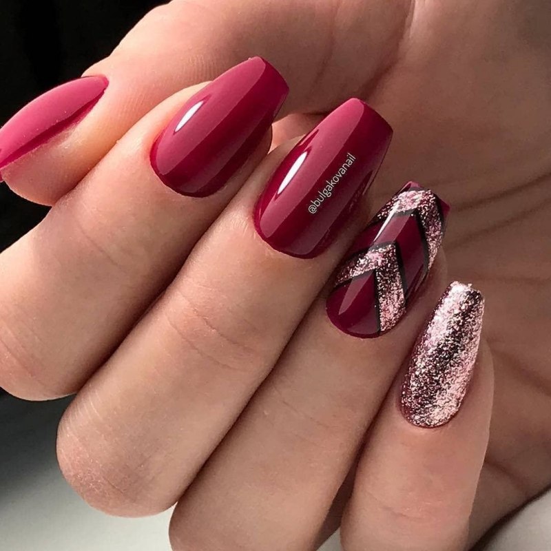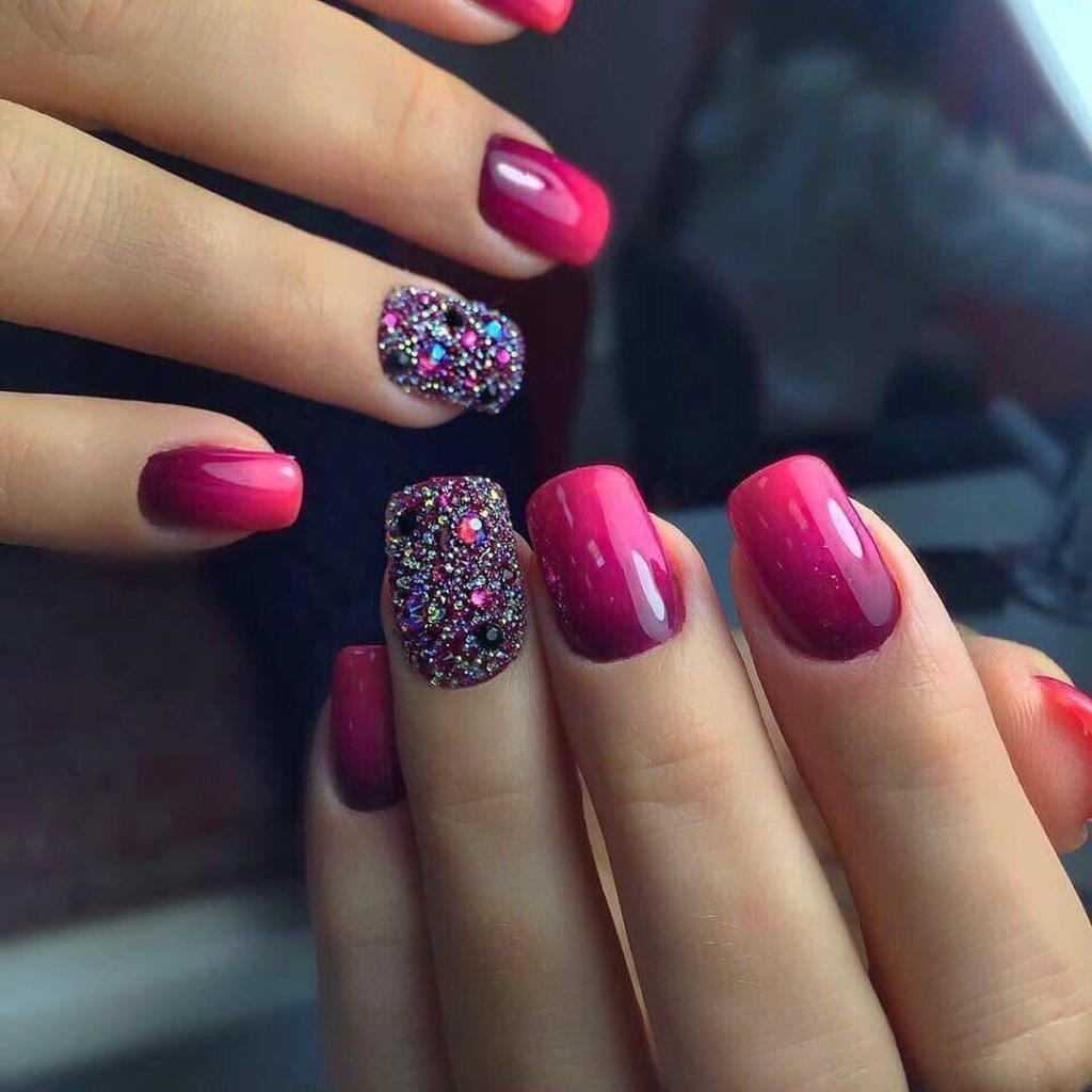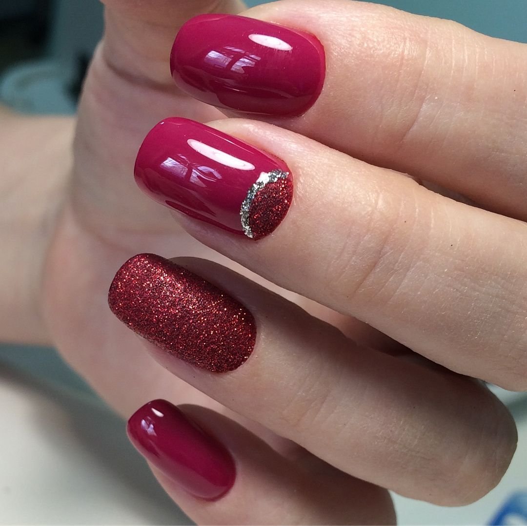 Малиновый маникюр с блестками