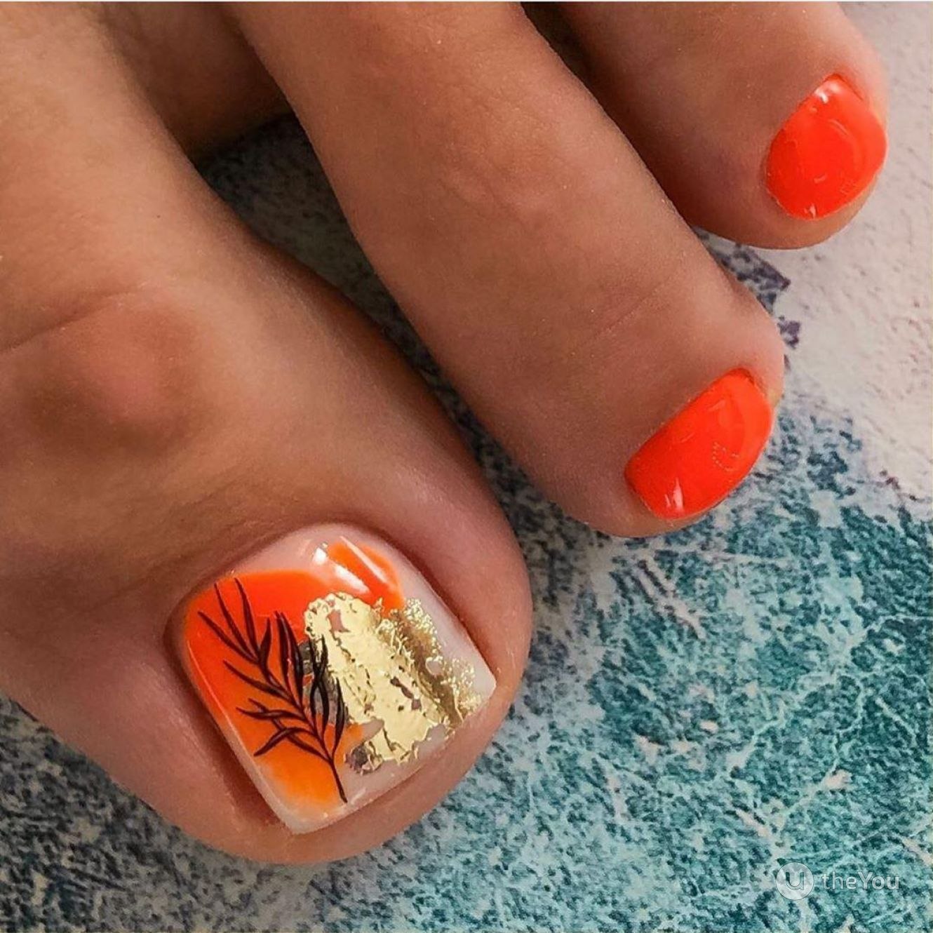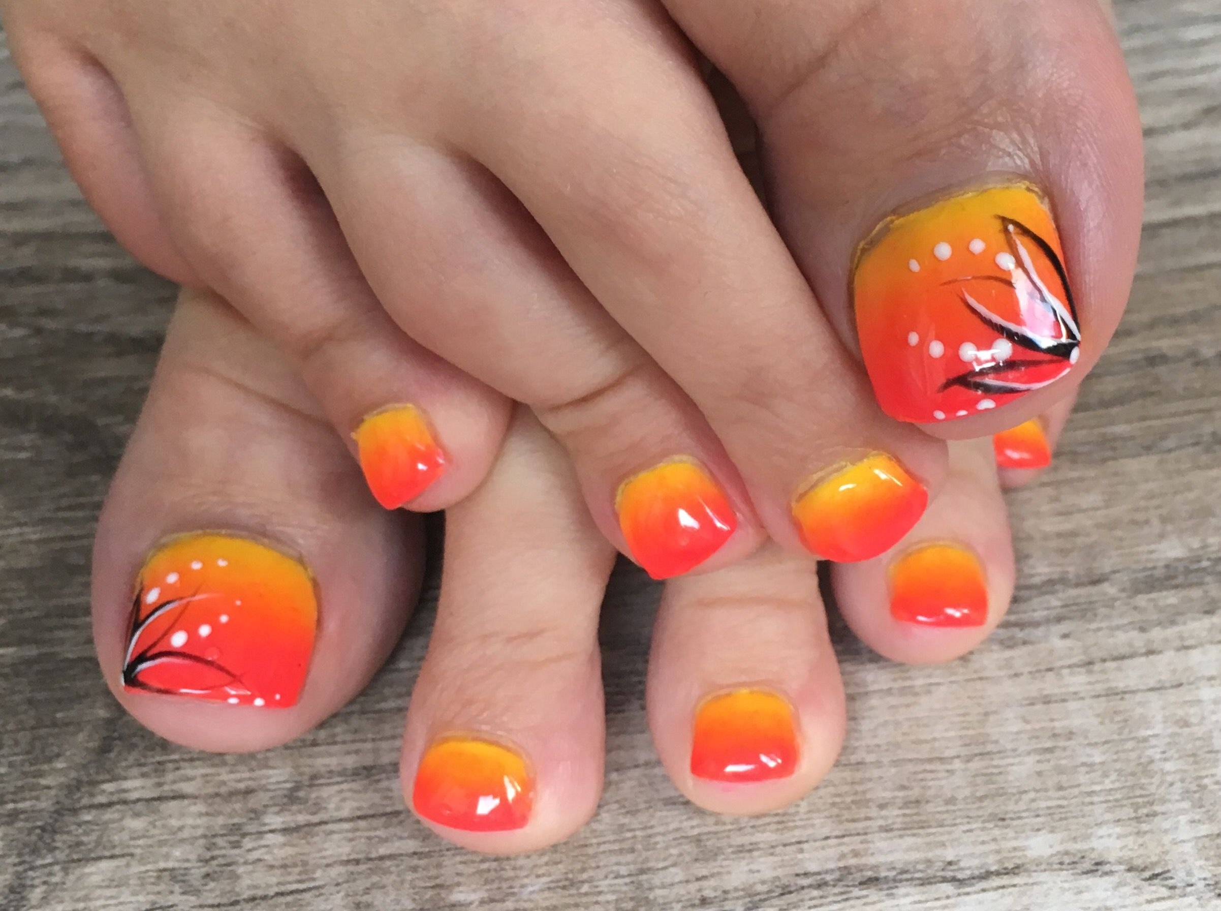 Педикюр в оранжевых тонах с рисунком