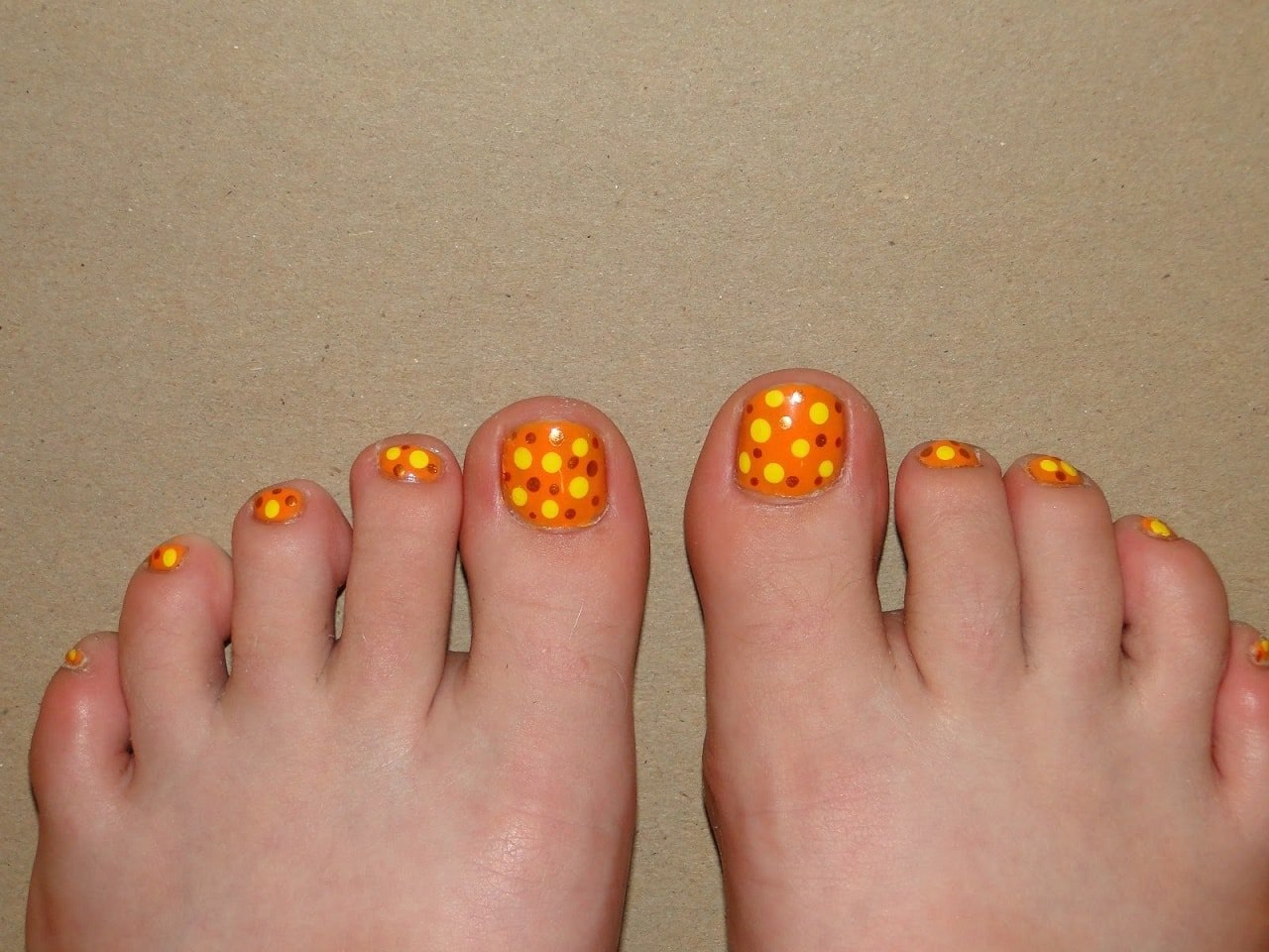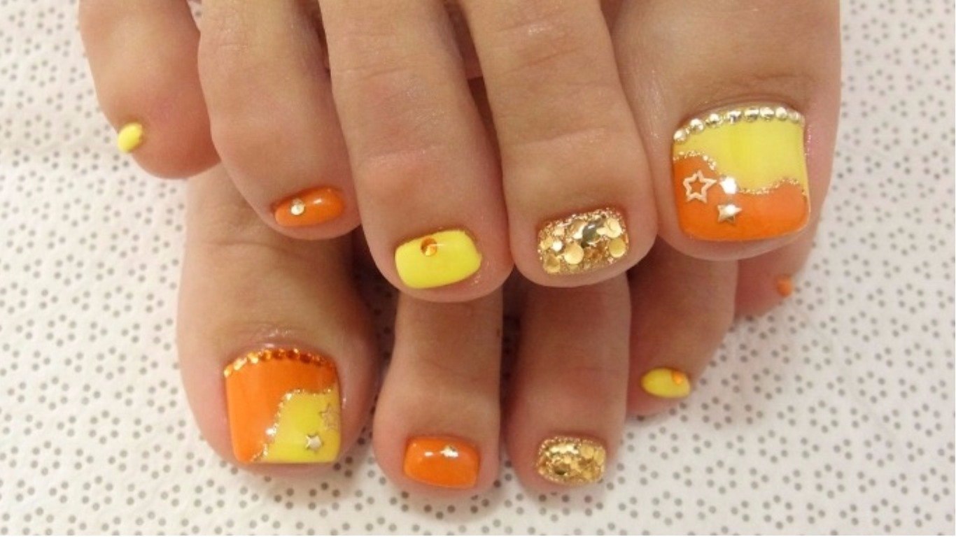 Желто оранжевый педикюр