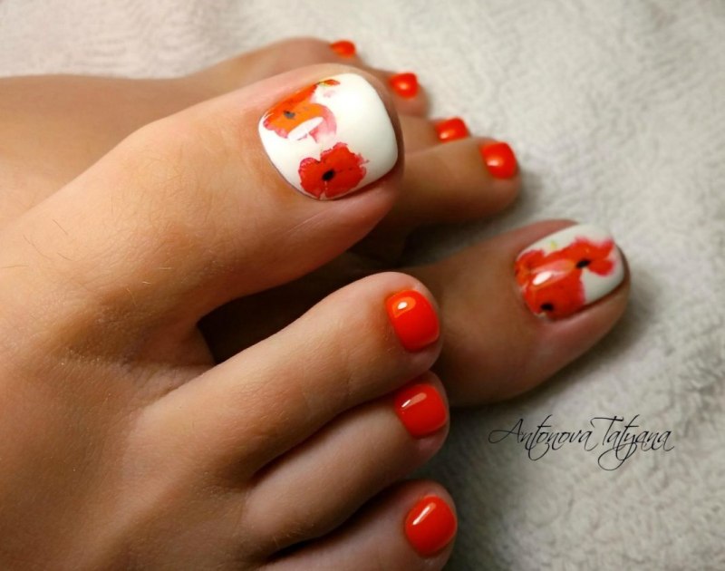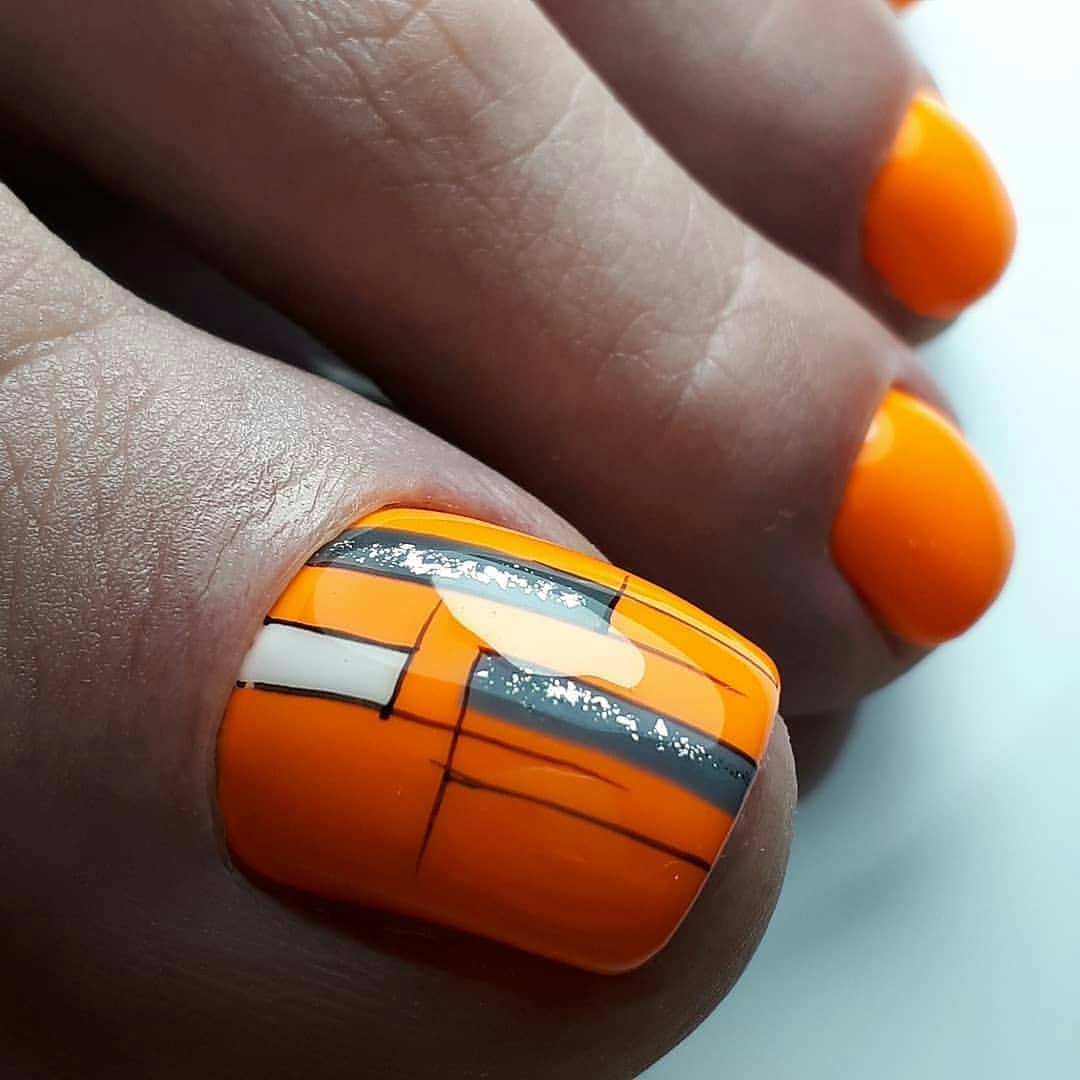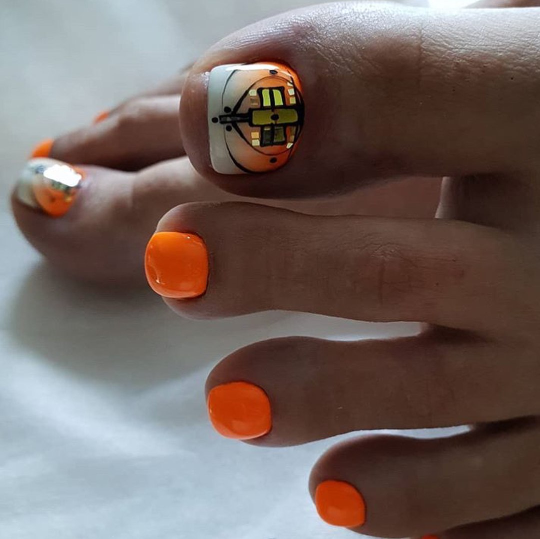 Оранжевый педикюр с дизайном