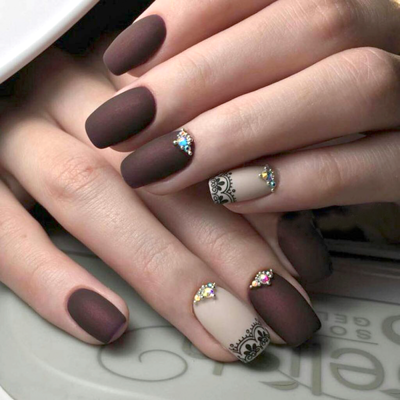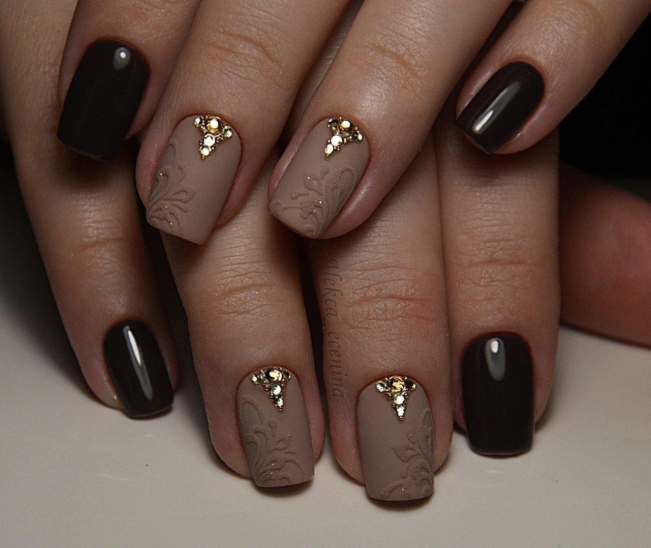 Коричневый маникюр со стразами