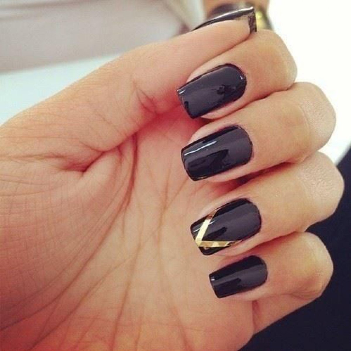 Черные ногти с золотым квадрат