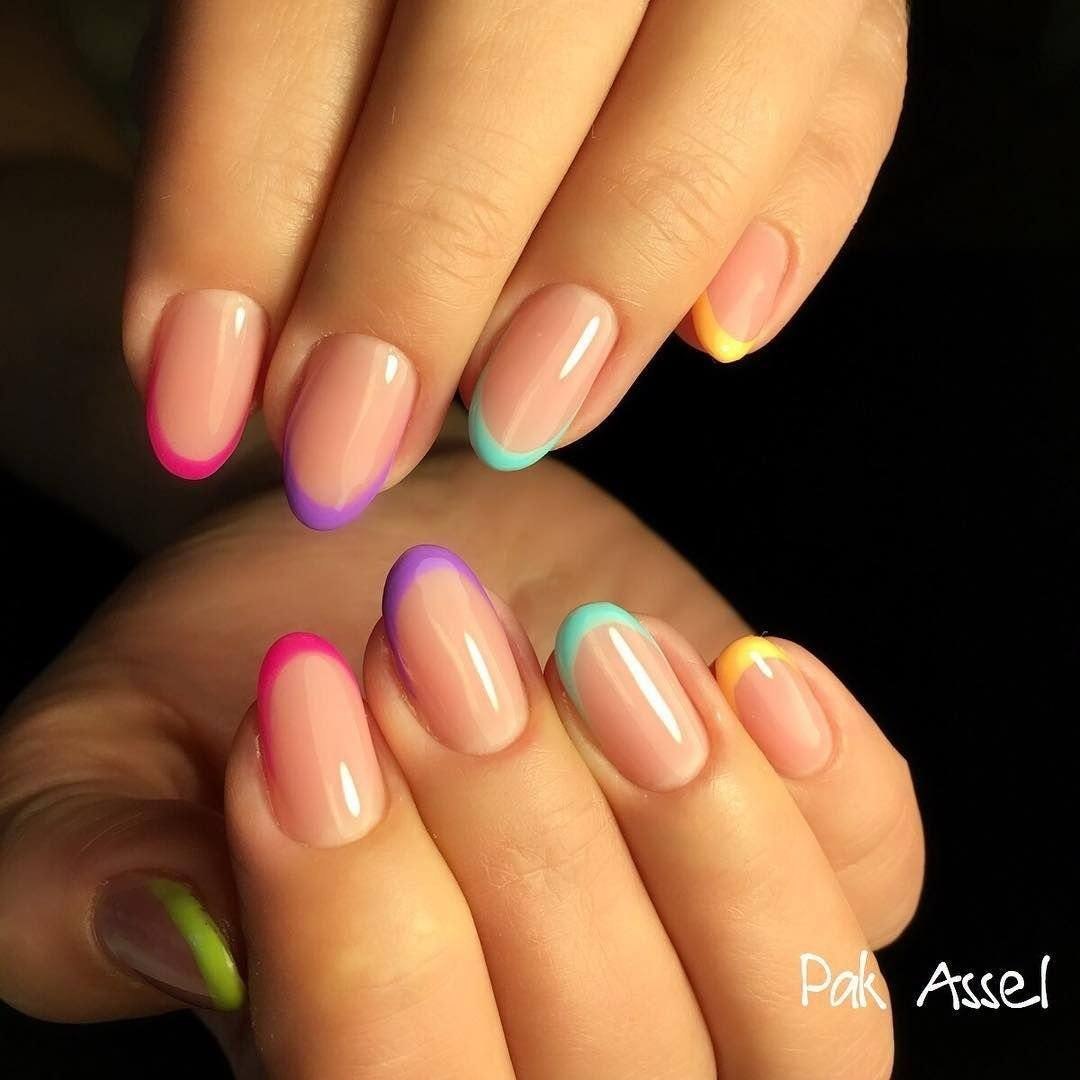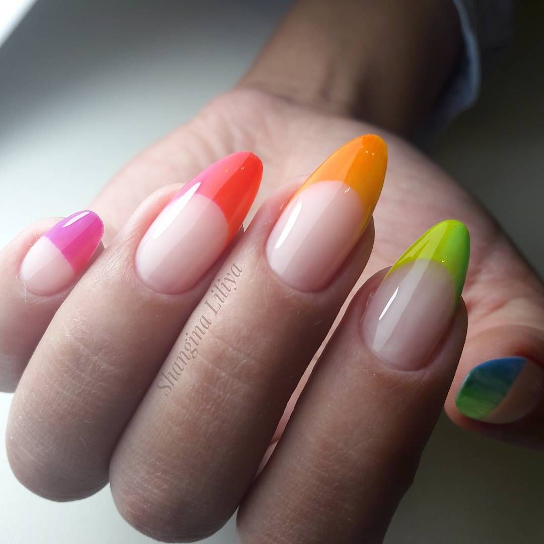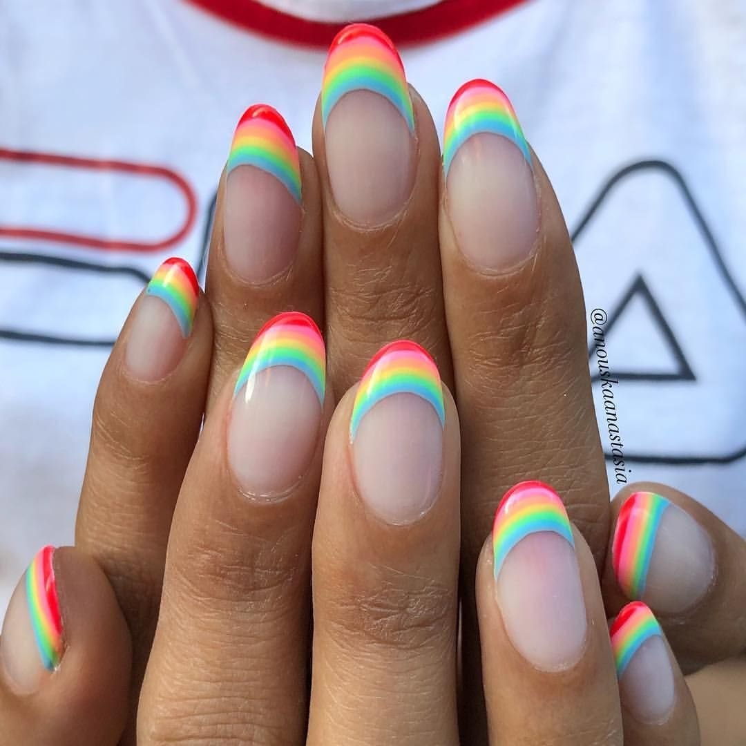 Радужный френч на миндалевидных ногтях 2020