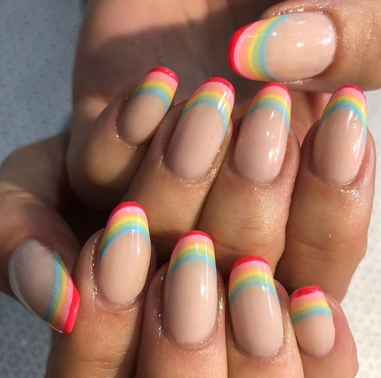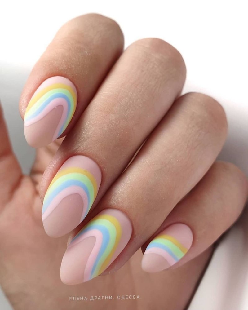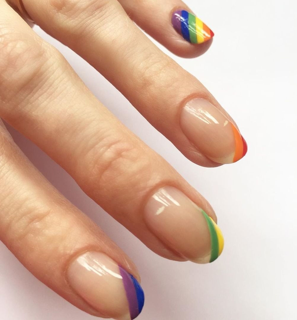 Радужный френч на миндалевидных ногтях 2020