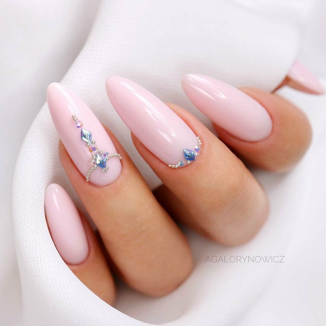 Розовый маникюр на миндалевидных ногтях