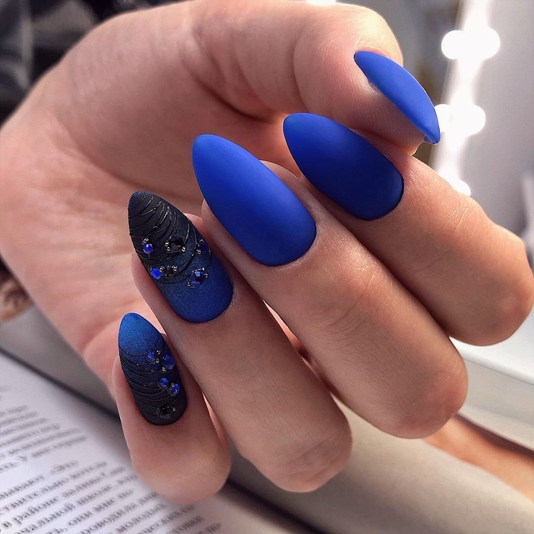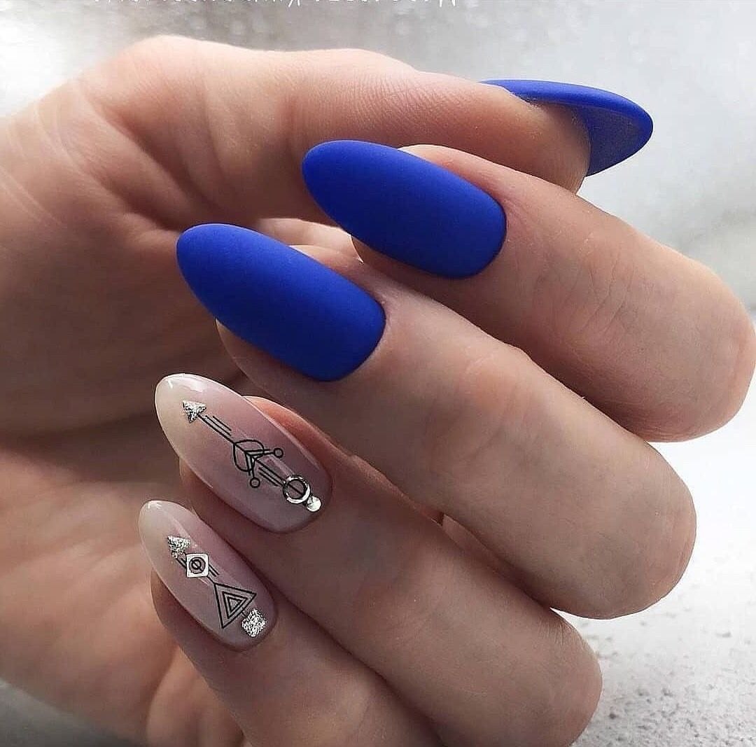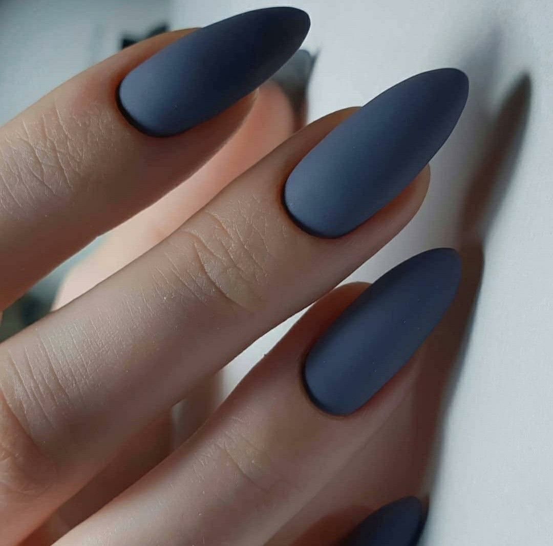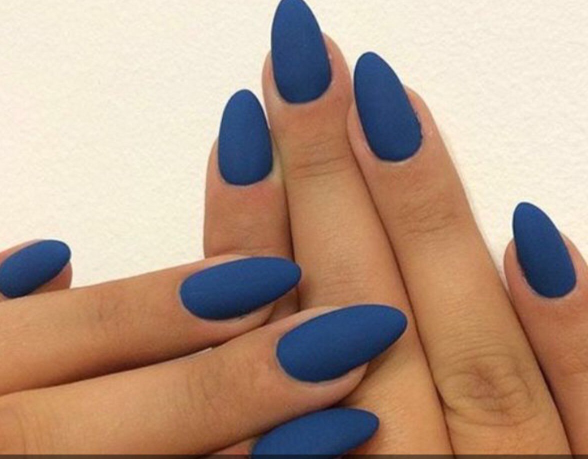 Синие матовые ногти миндаль дизайн
