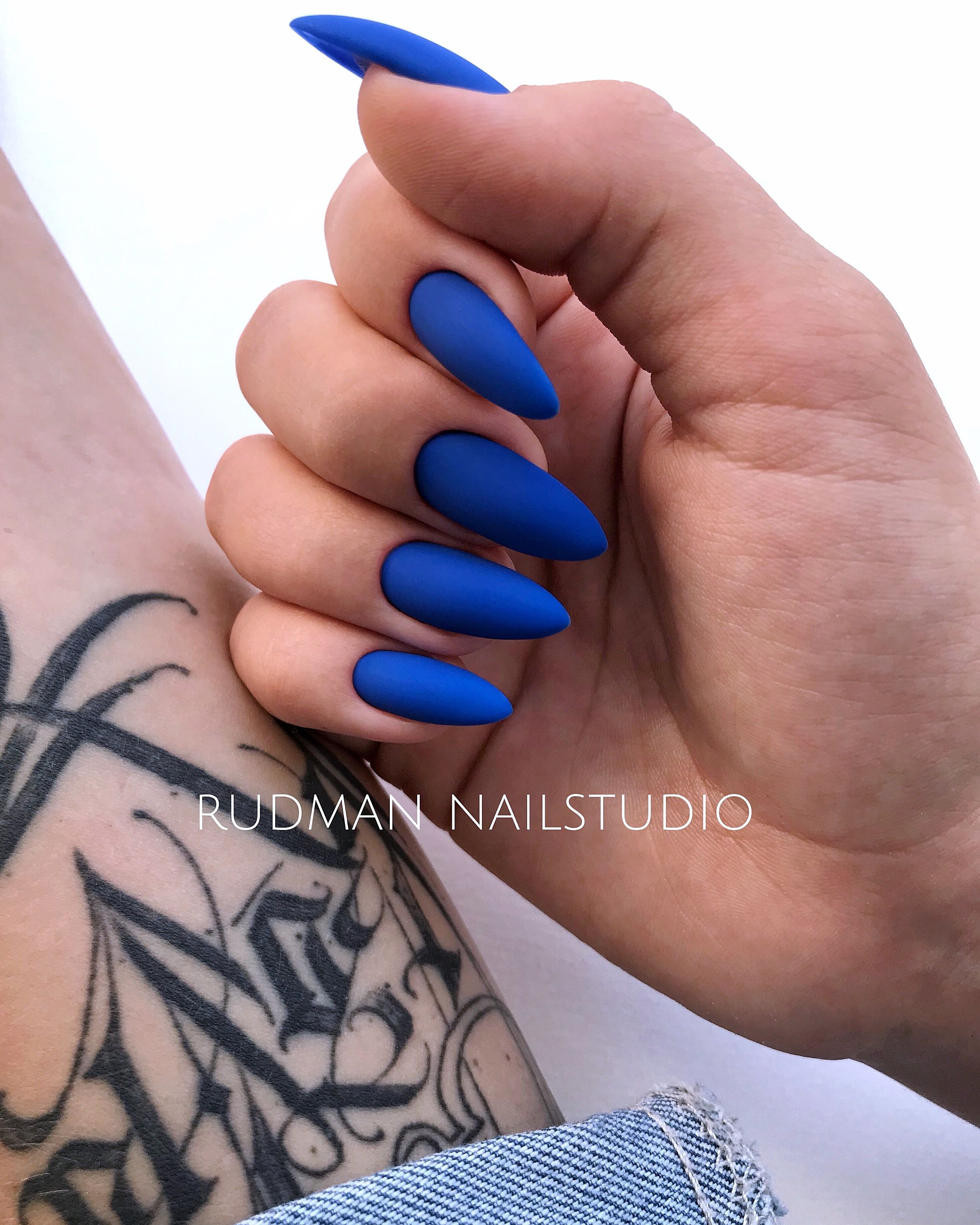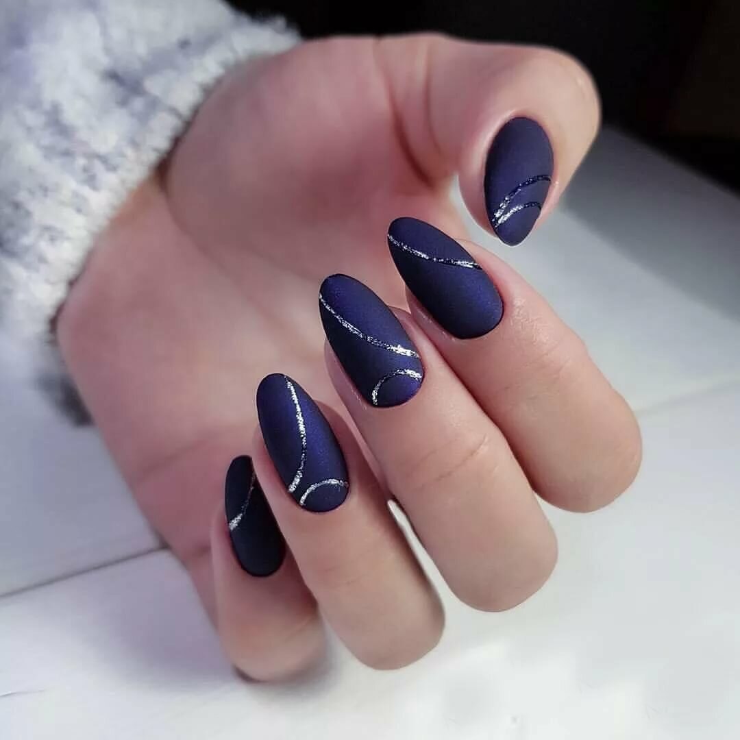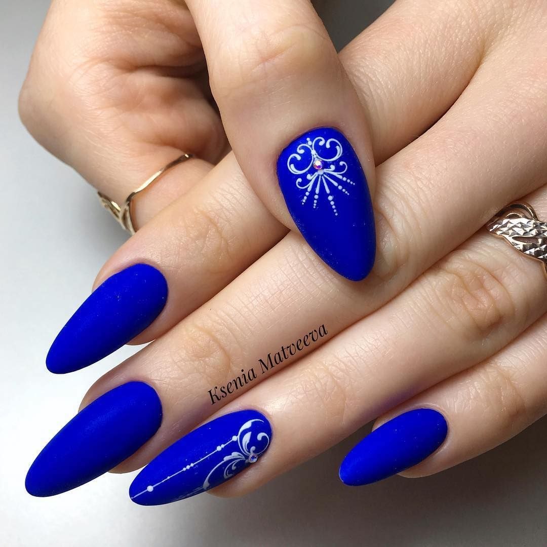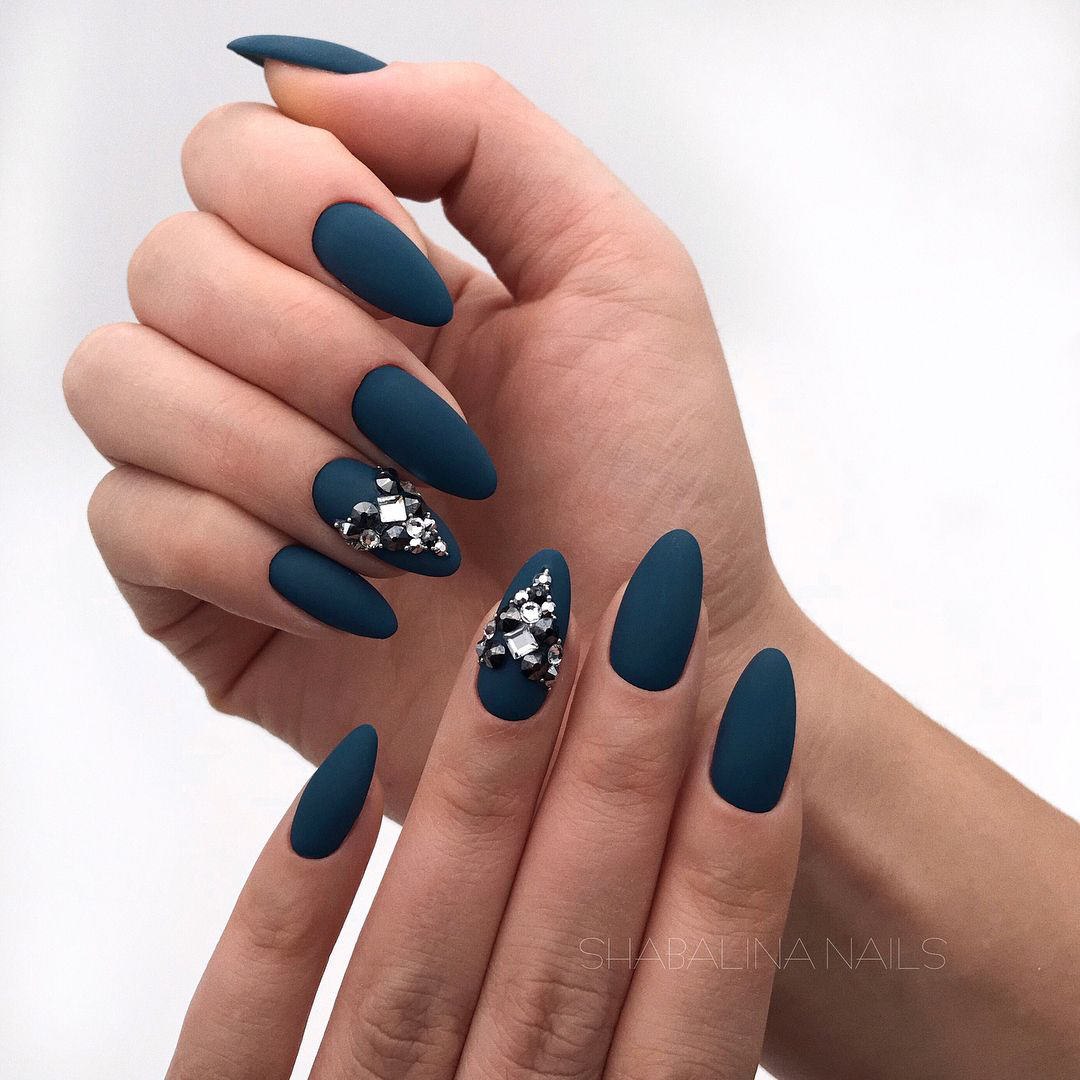Синие матовые ногти миндаль дизайн