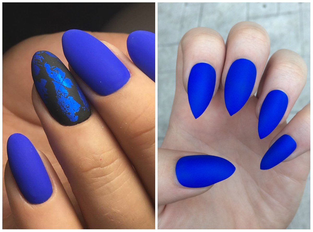 Синий матовый маникюр миндаль