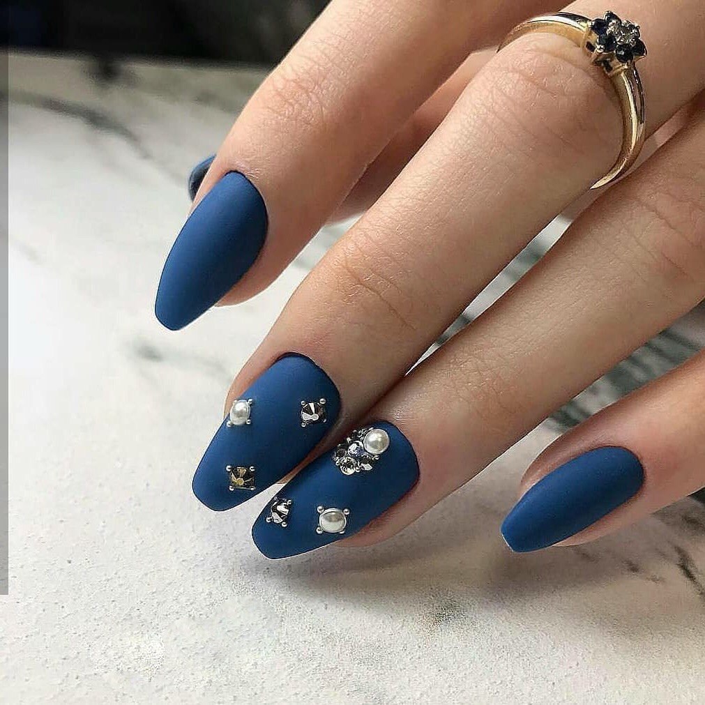 Синие матовые ногти со стразами
