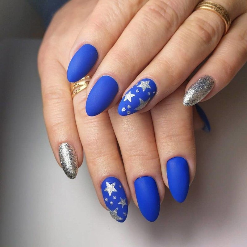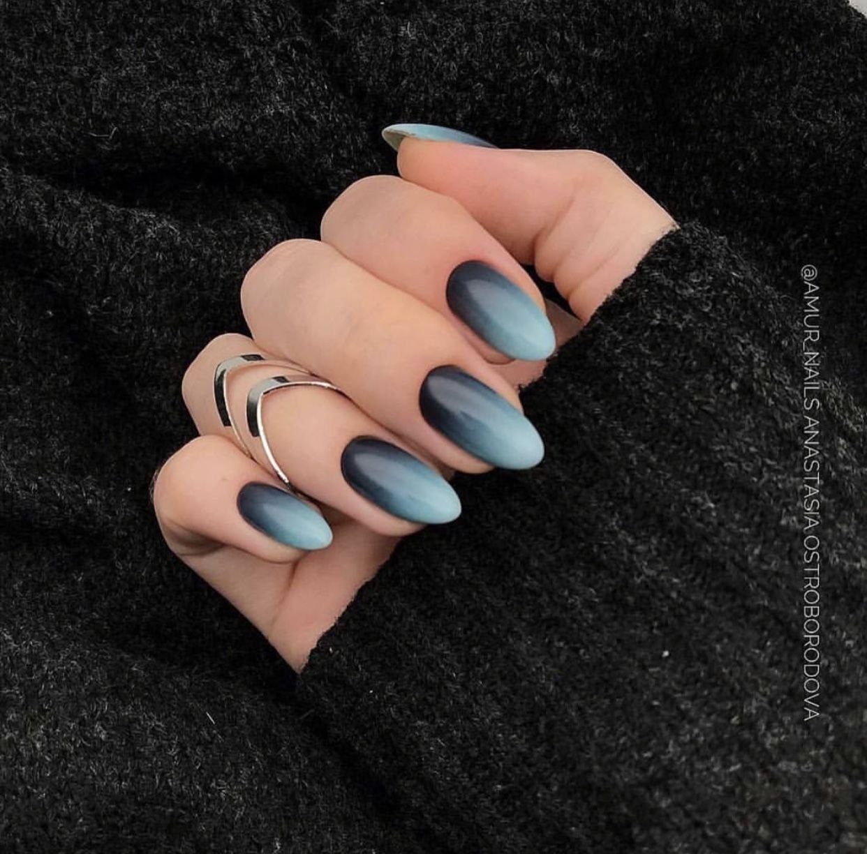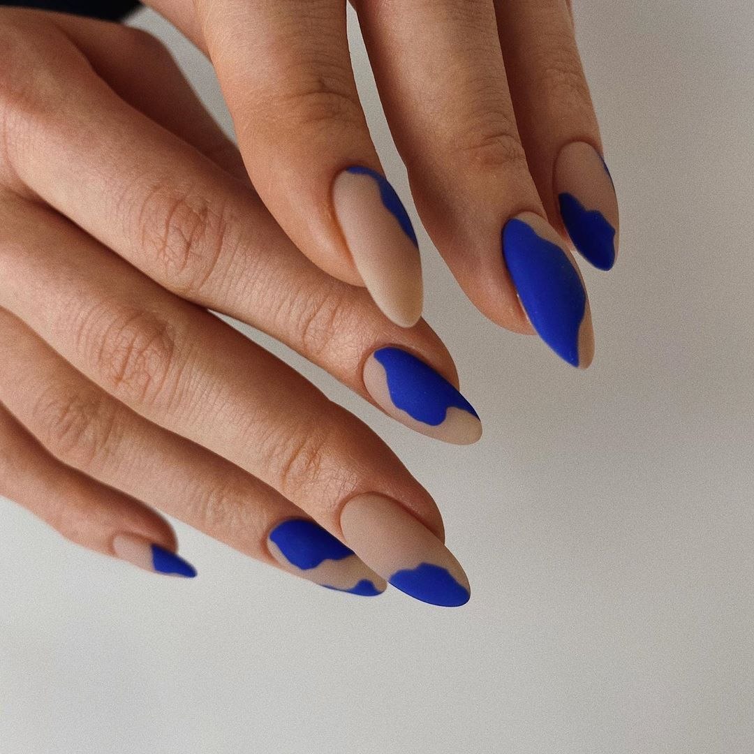 Синий матовый маникюр миндаль 2022