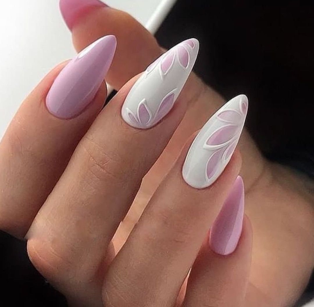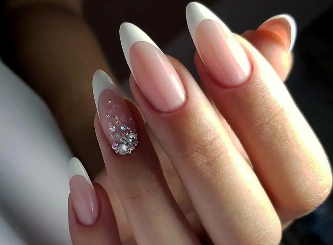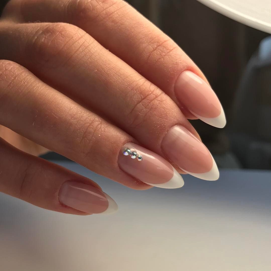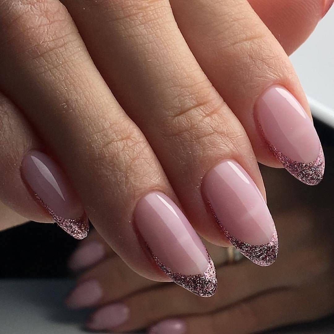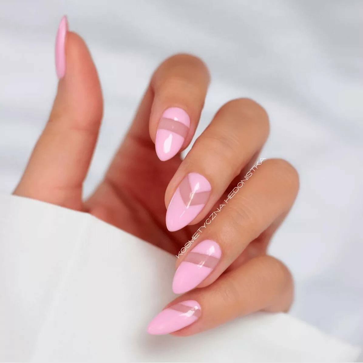 Розовый френч на миндалевидных ногтях с дизайном 2021