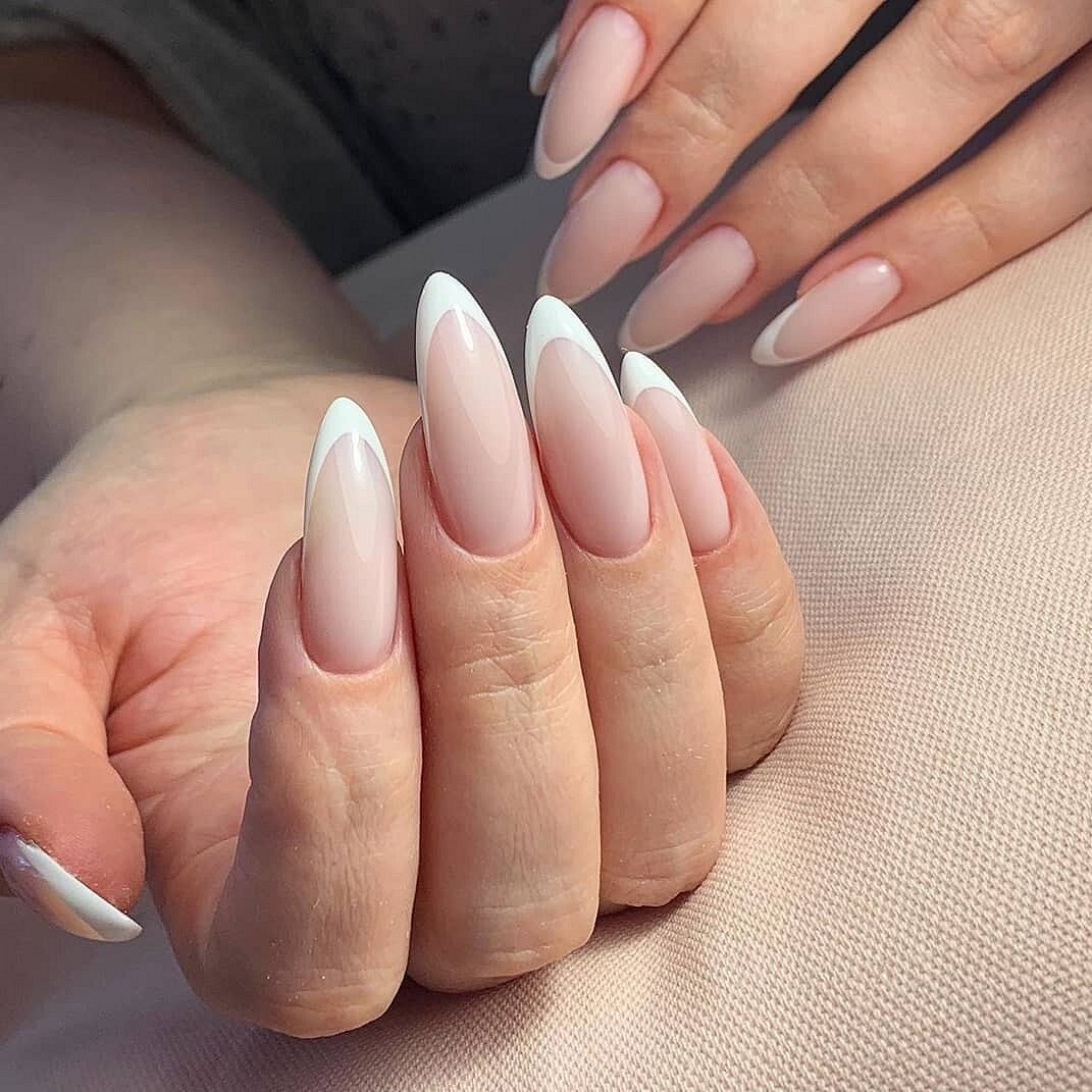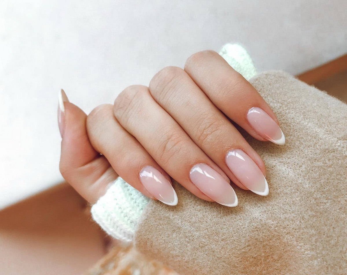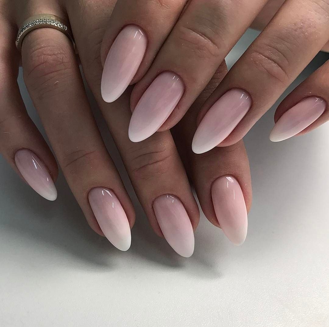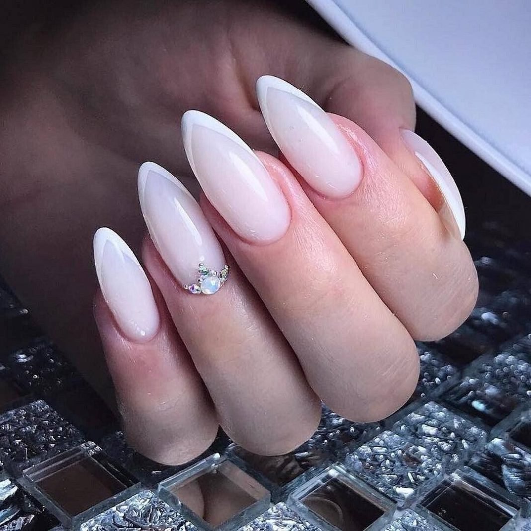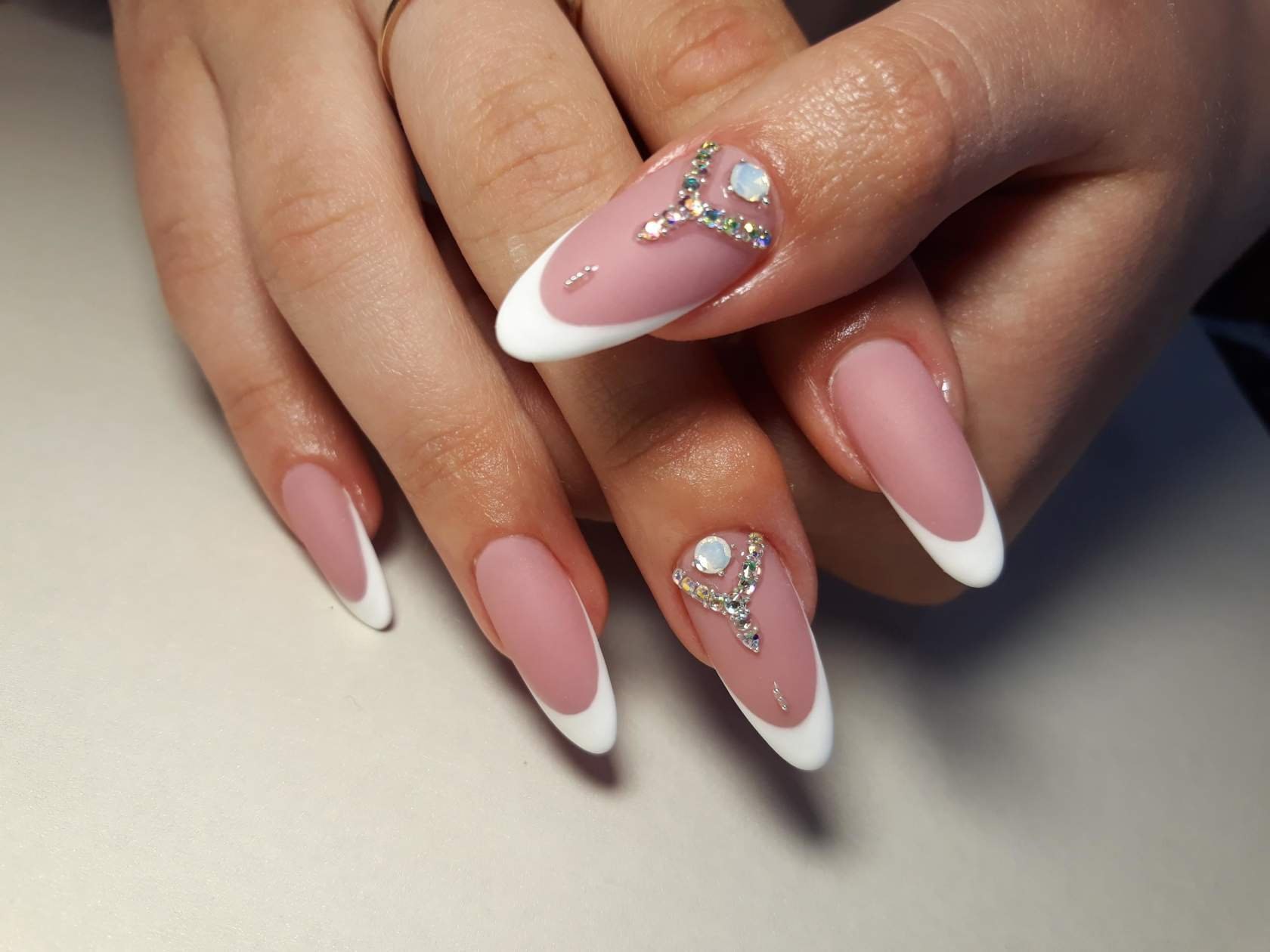Розовый френч на миндалевидных ногтях с дизайном 2021