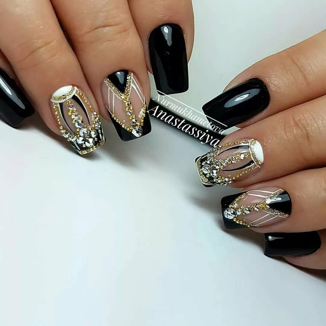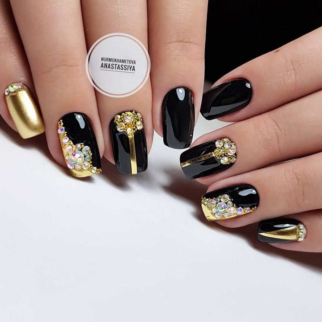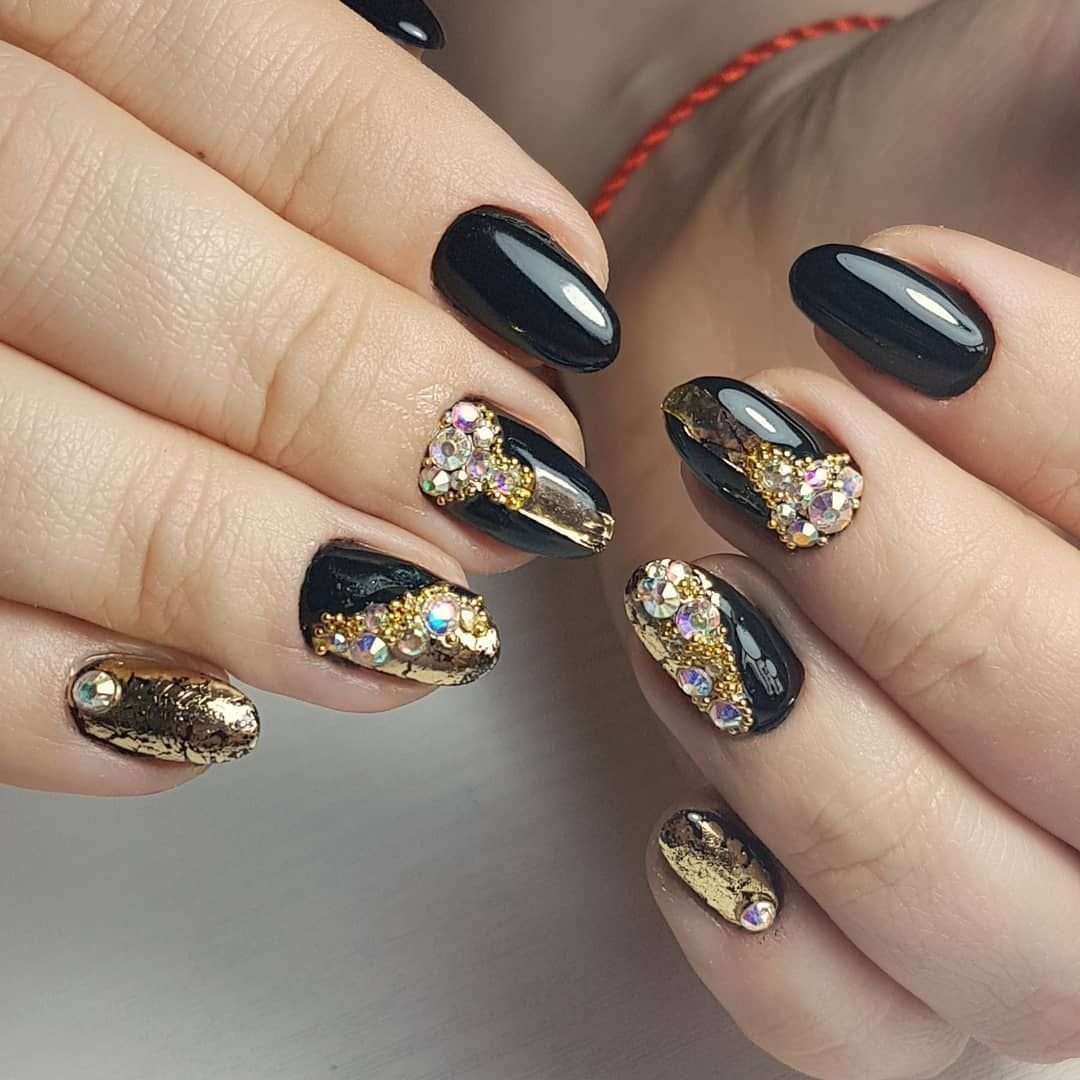 Маникюр чёрный с золотом и стразами