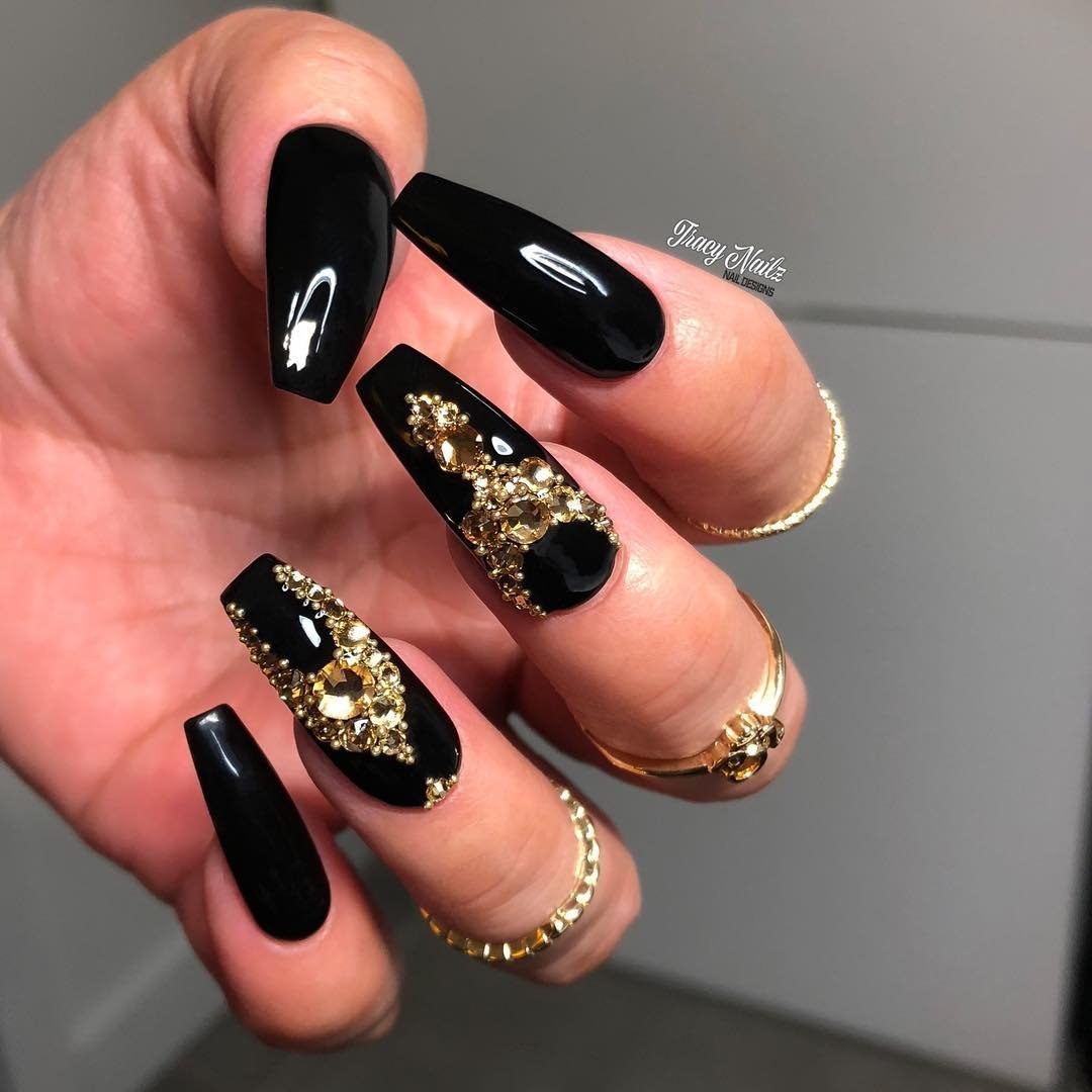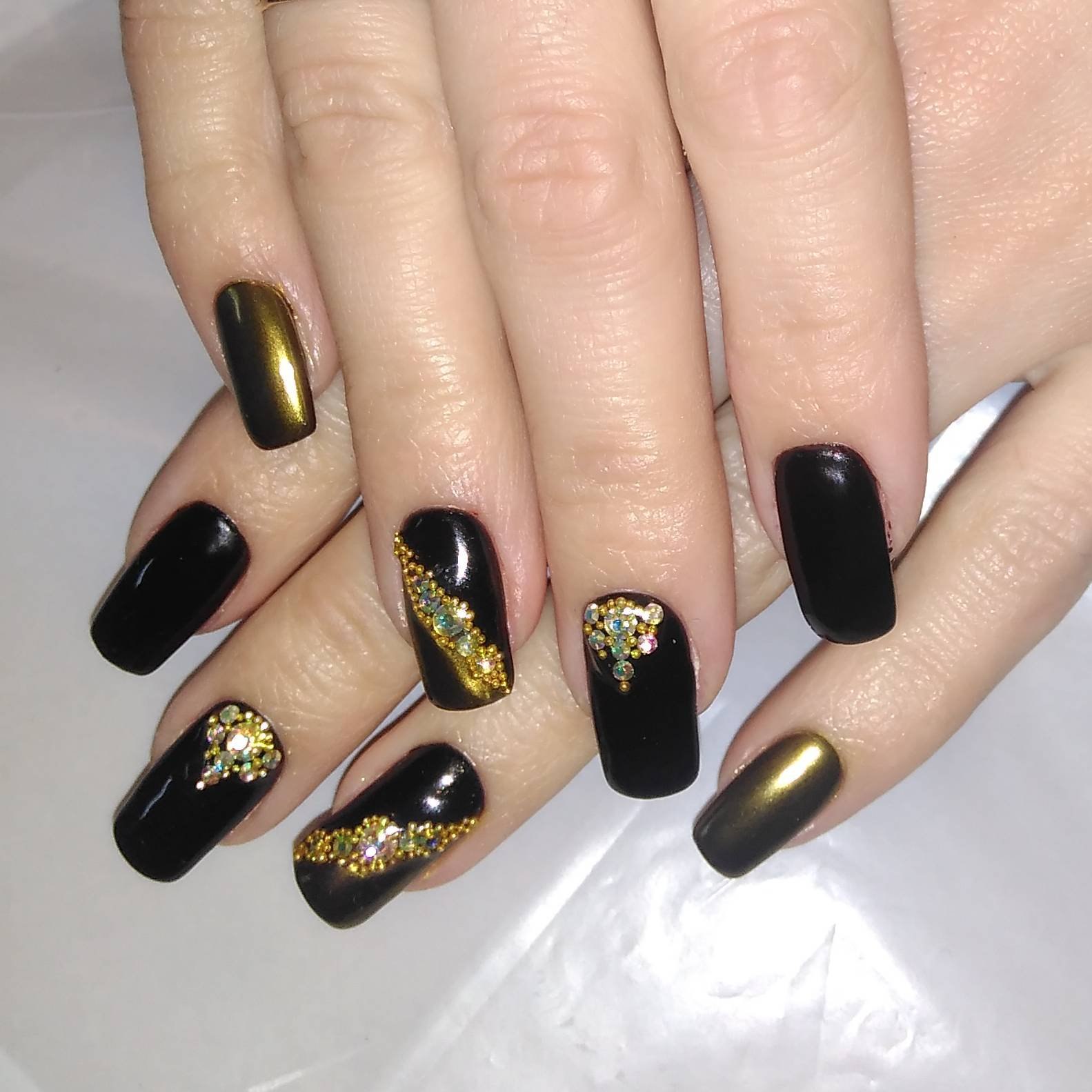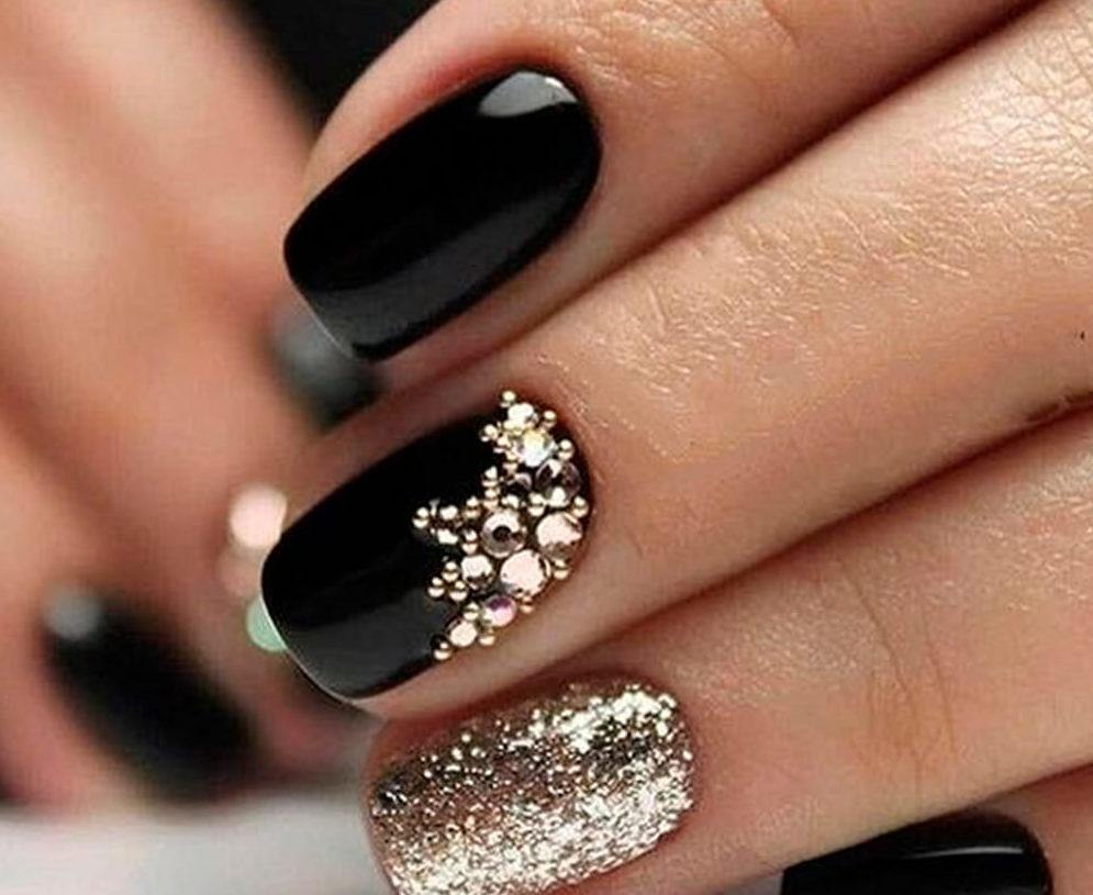 Маникюр чёрный с золотом и стразами
