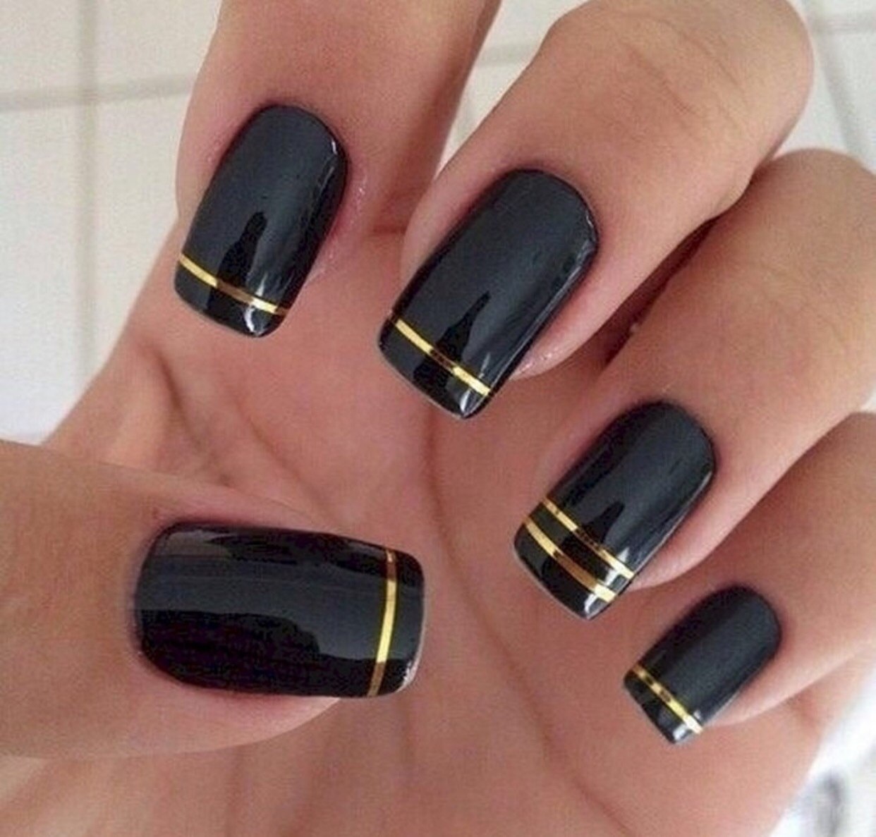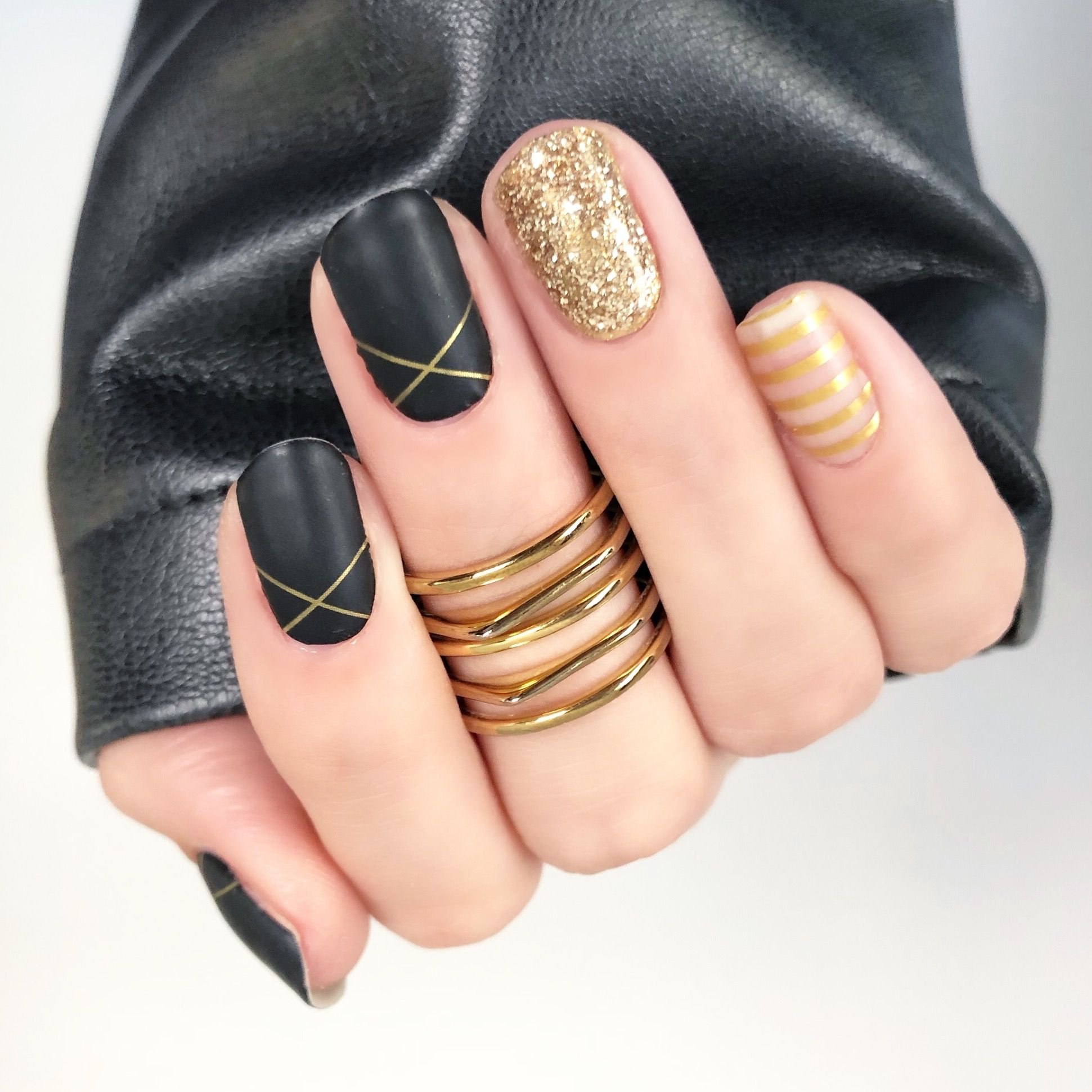 Черный маникюр с золотыми полосками