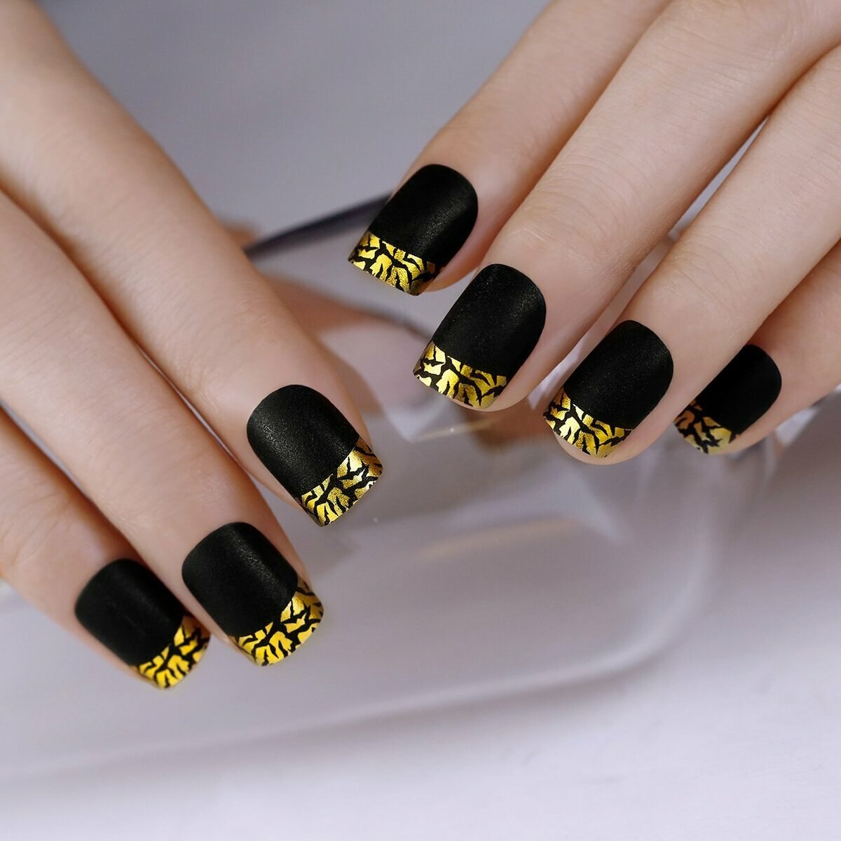 Чёрный френч с золотом на ногтях
