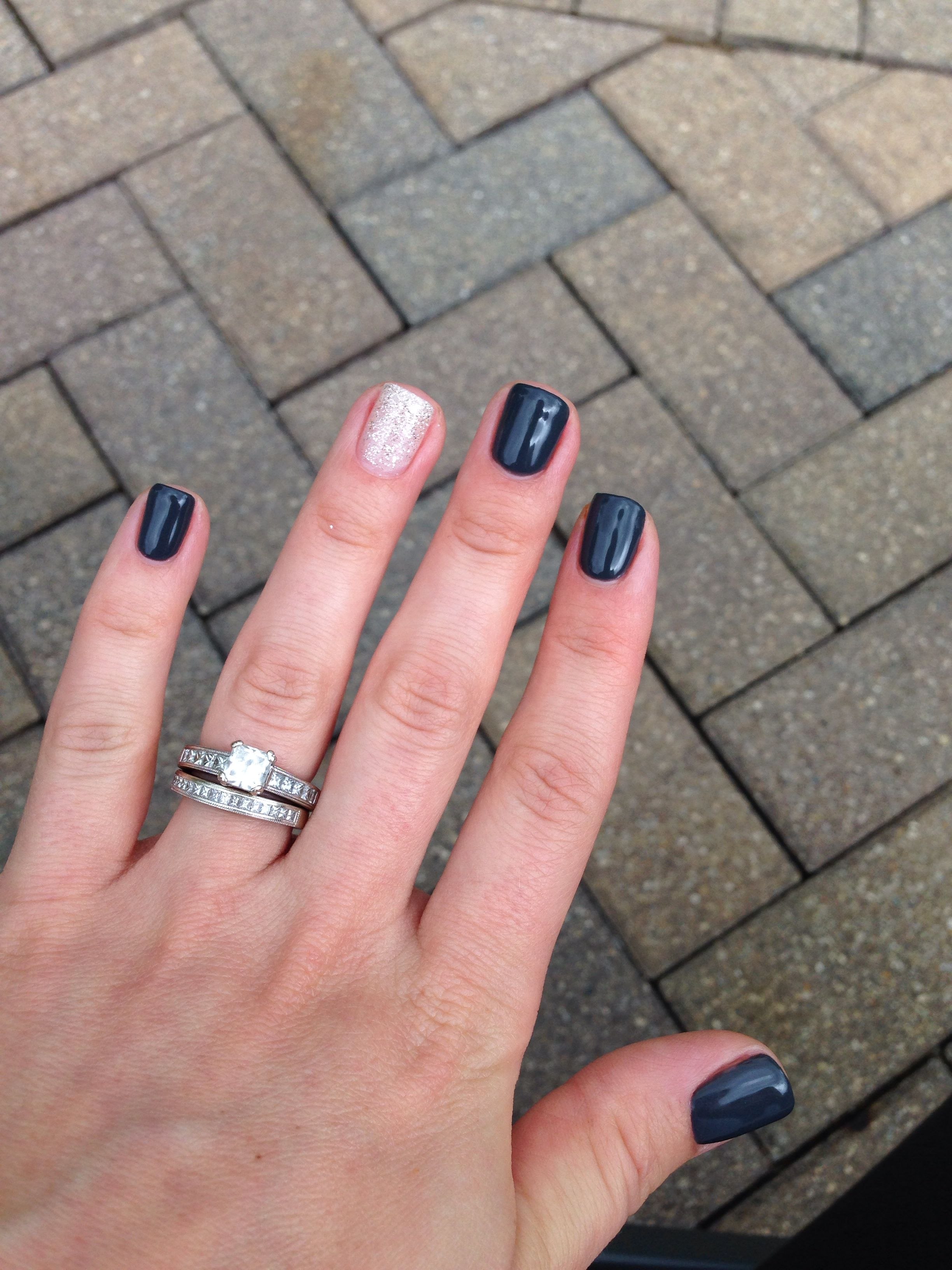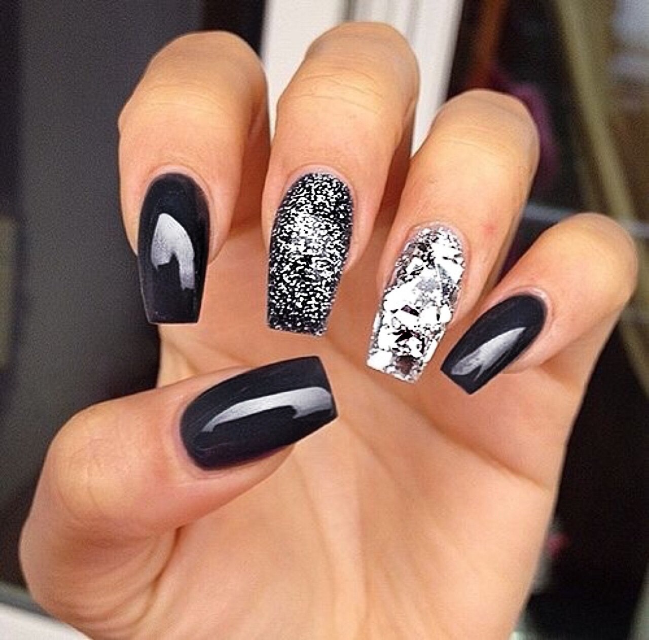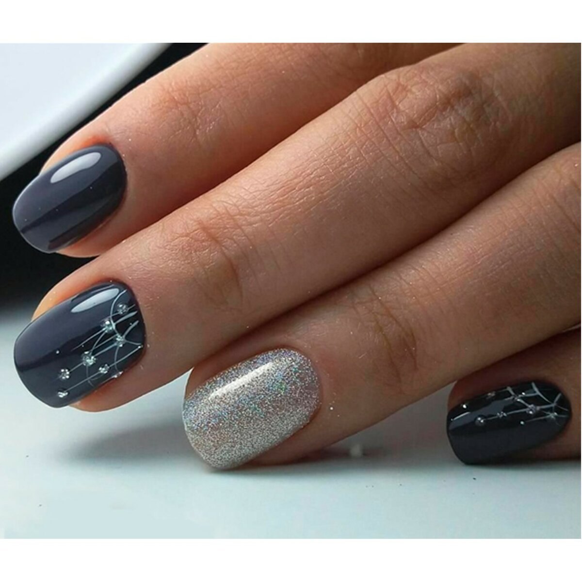 Черный маникюр с серыми блестками