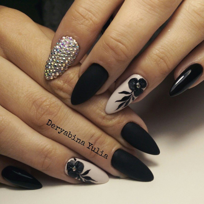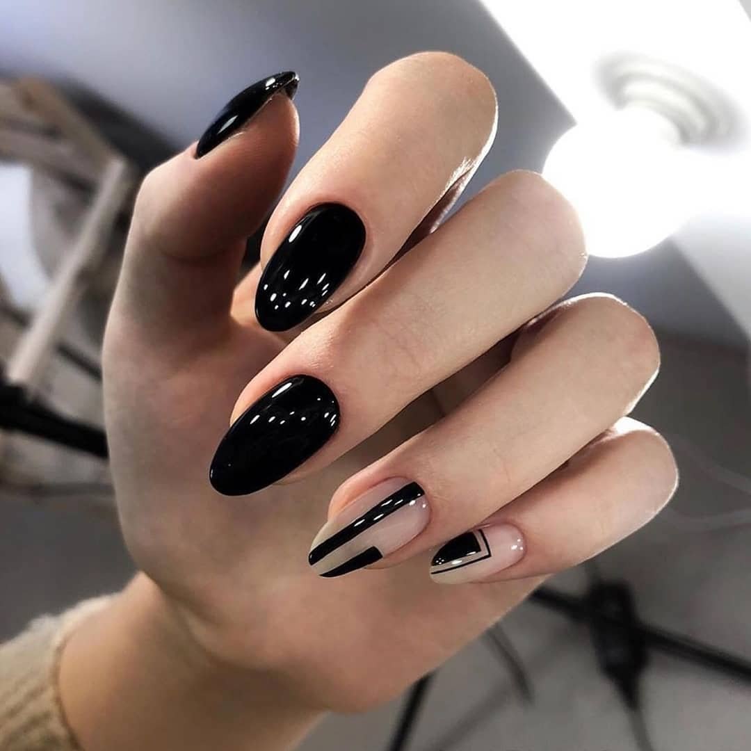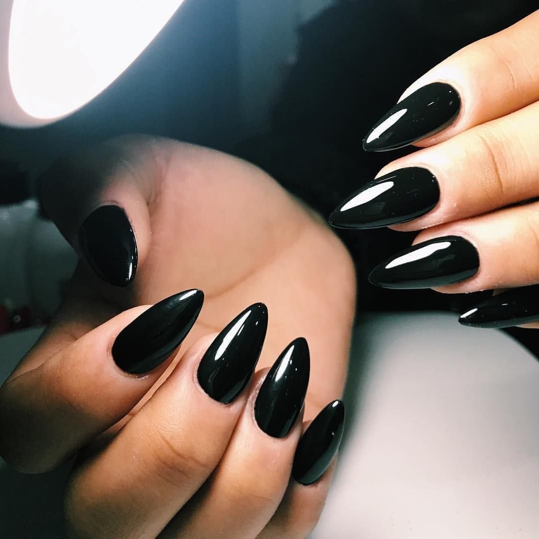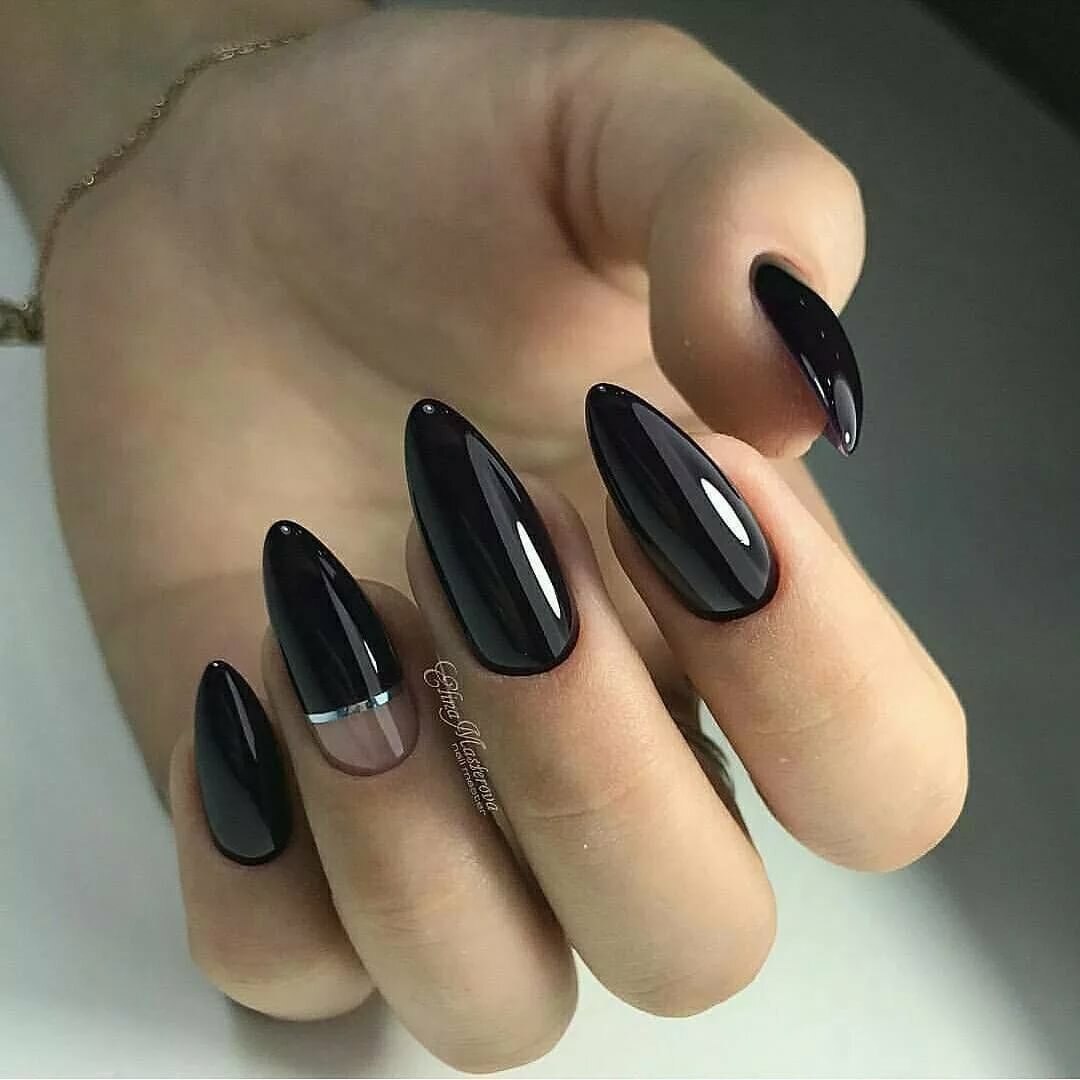 Маникюр на длинные ногти миндалевидной формы с дизайном 2021 черные