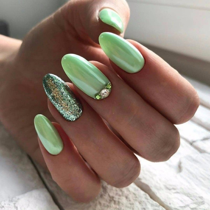 Маникюр лето 2022 салатовый с блестками