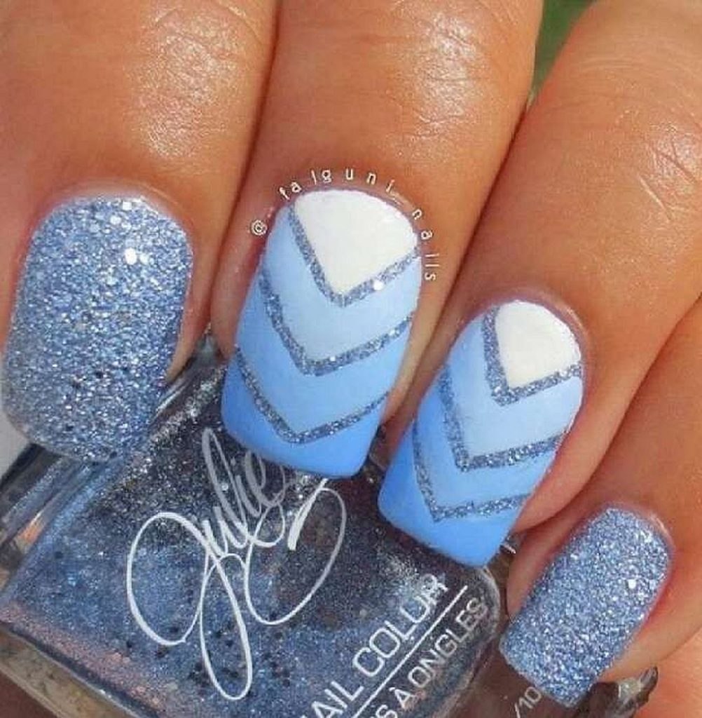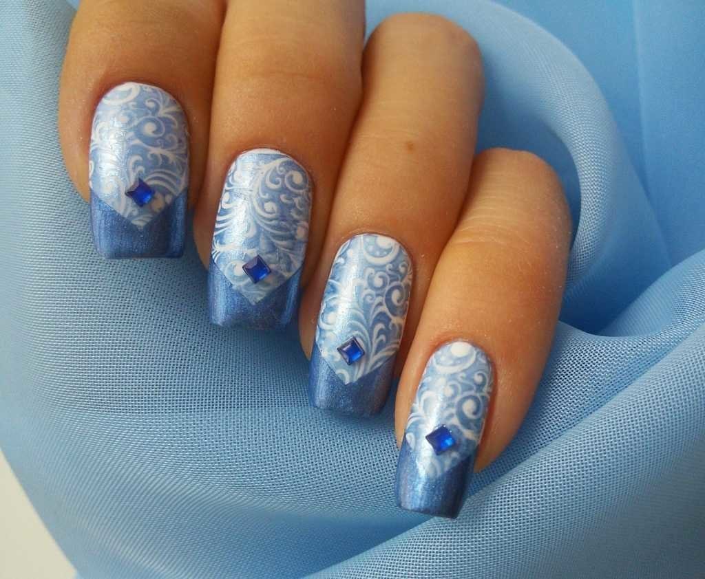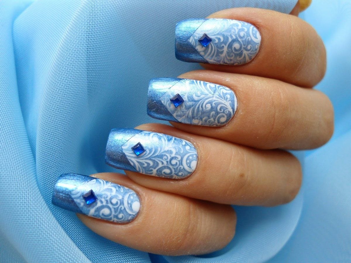 Маникюр голубой с белым и серебристым