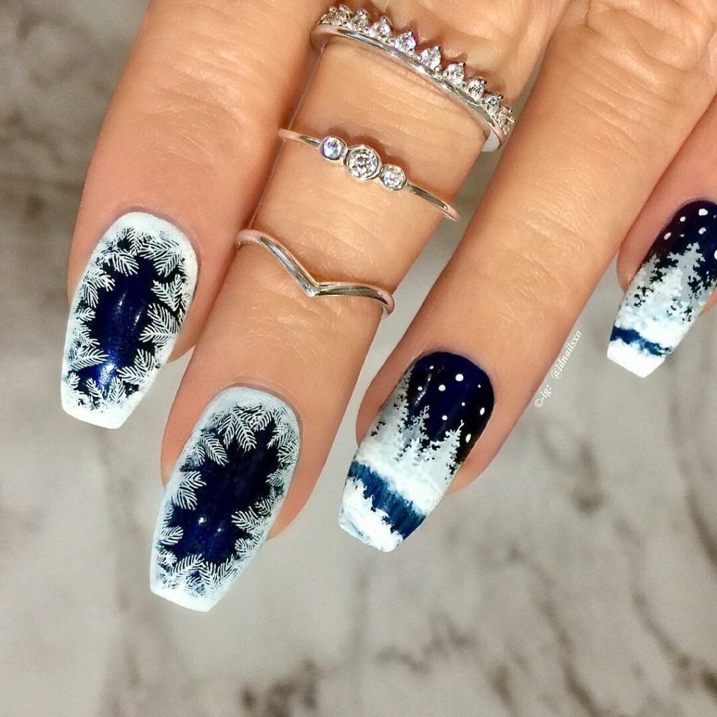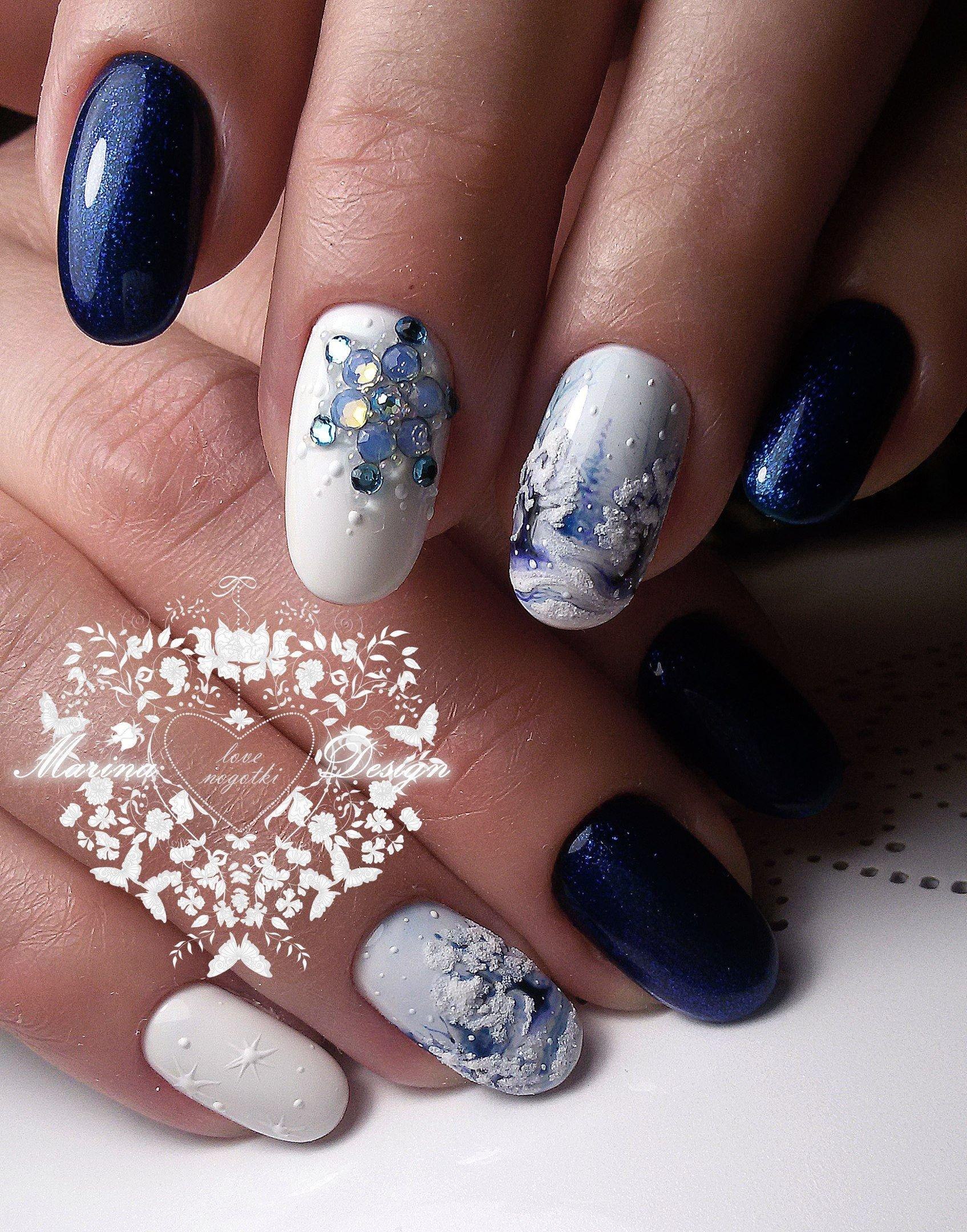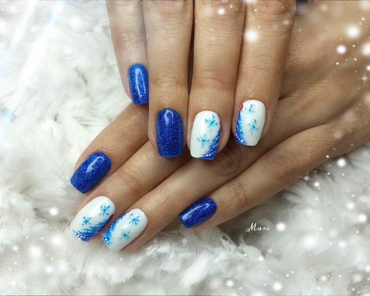Новогодний маникюр синий с белым