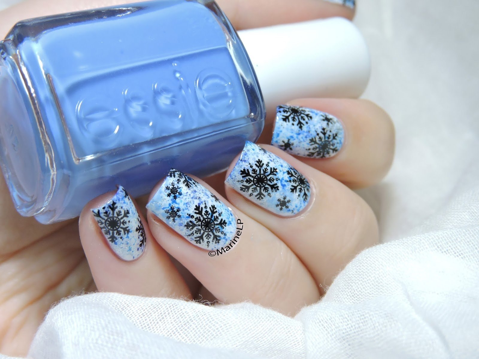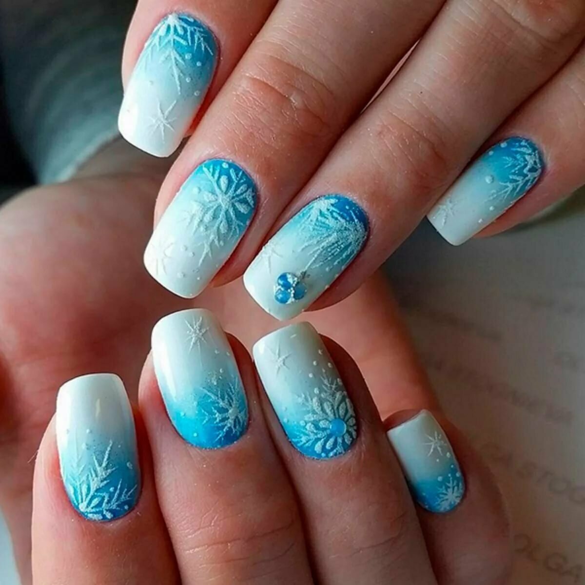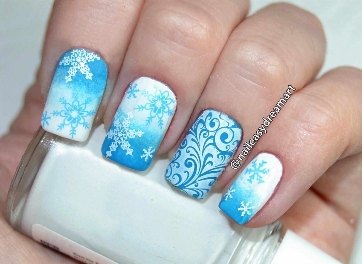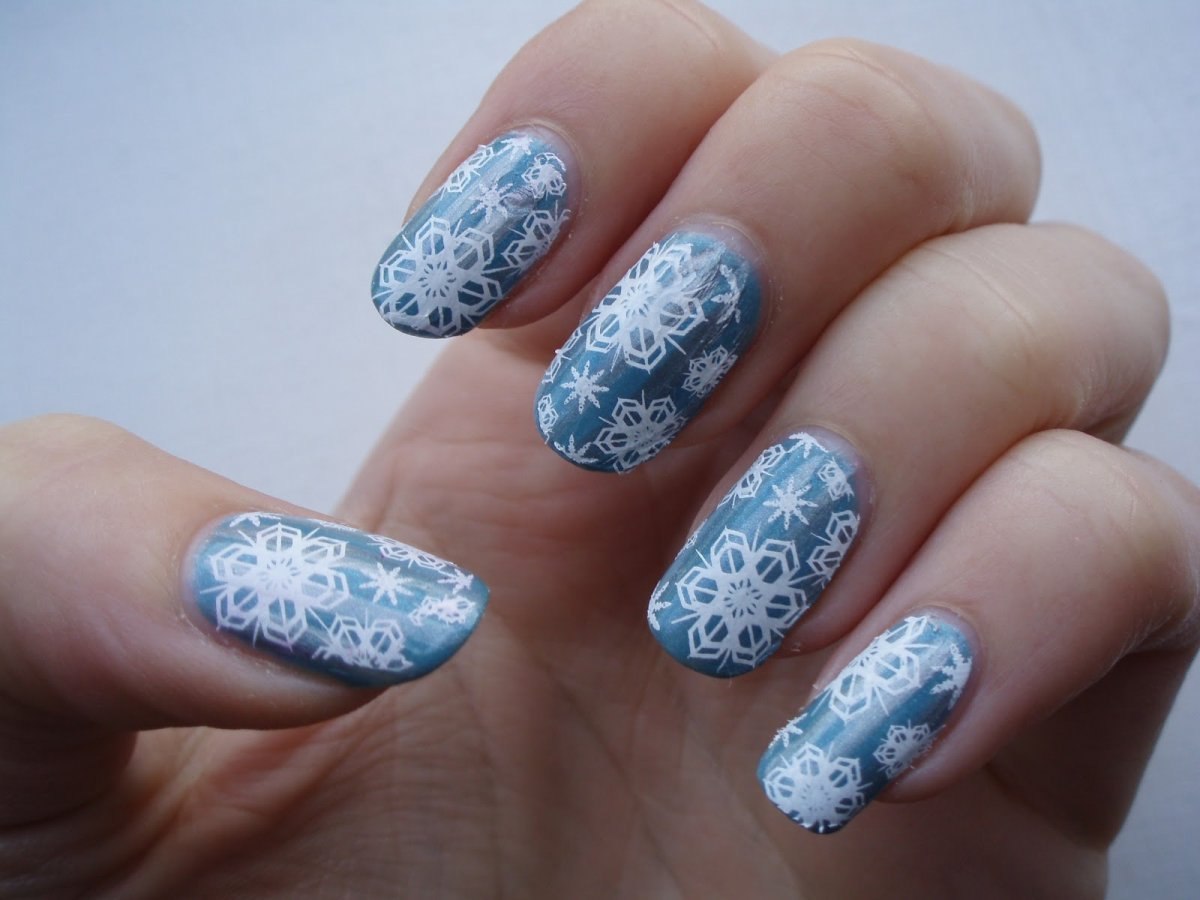 Маникюр белый с голубыми снежинками
