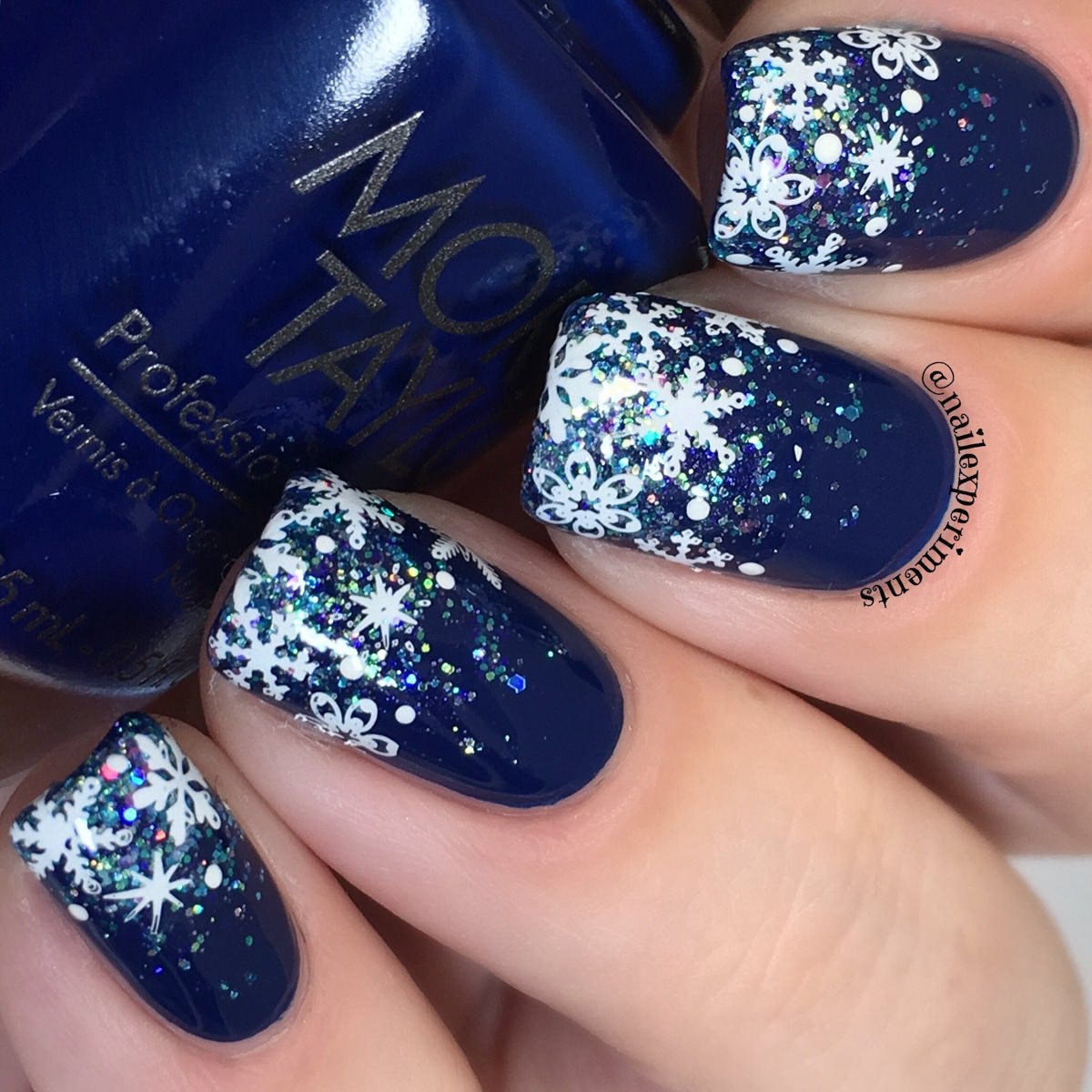 Синий маникюр со снежинками и блестками