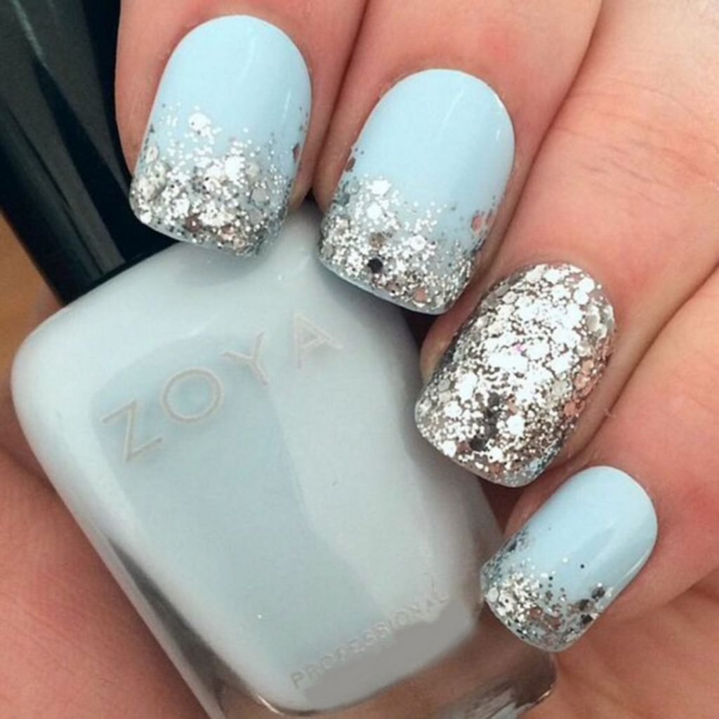 Маникюр омбре нежно голубой с блёстками