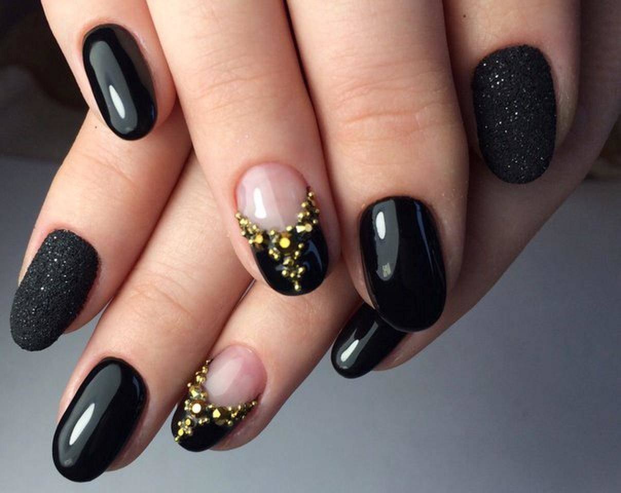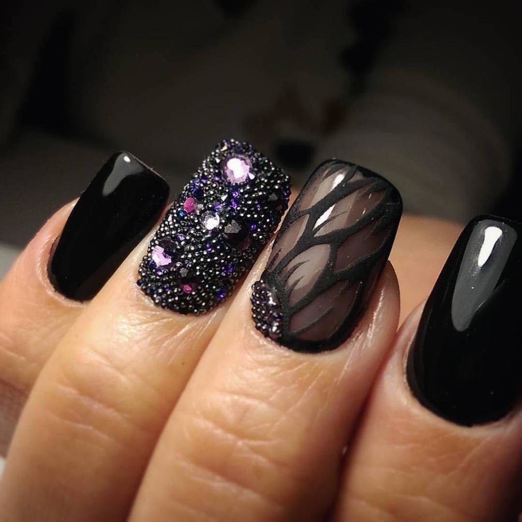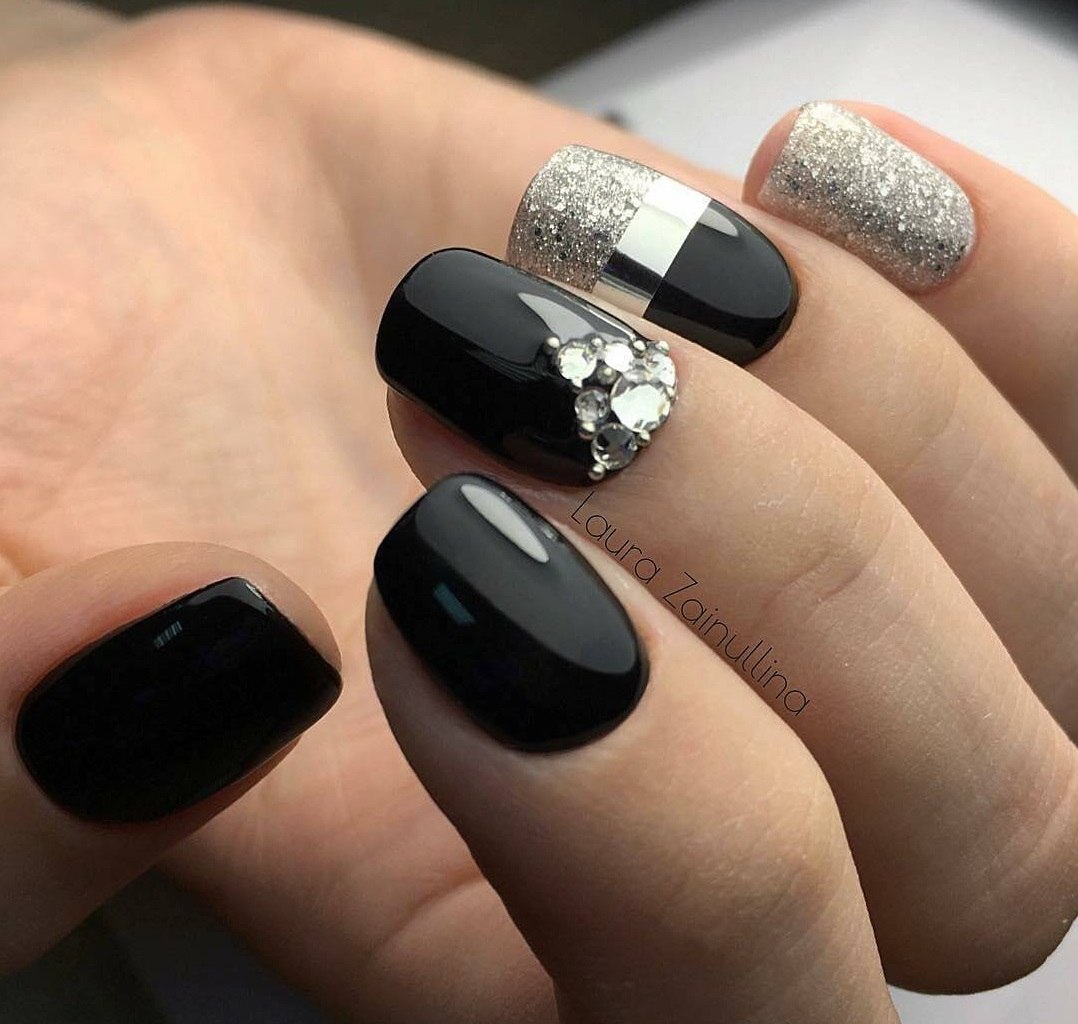 Маникюр чёрный со стразами и блестками