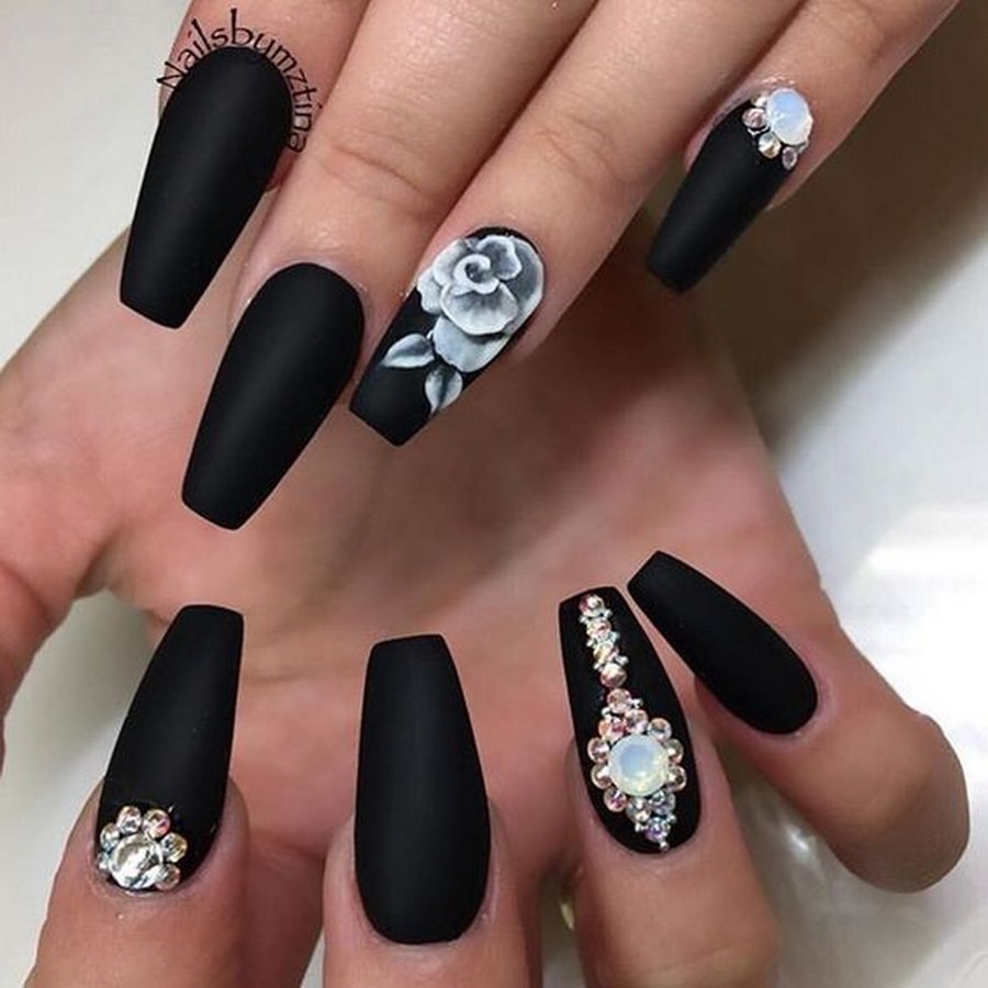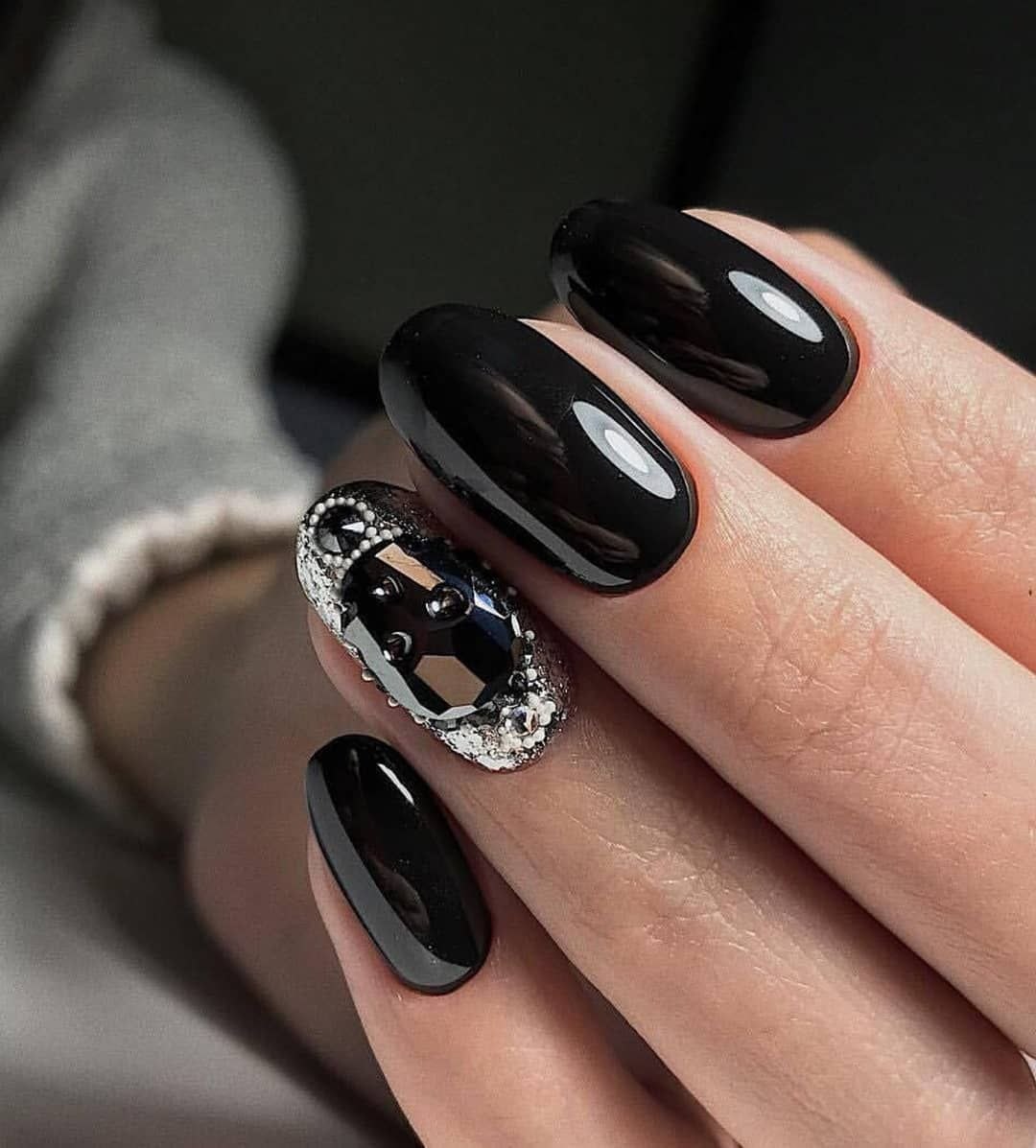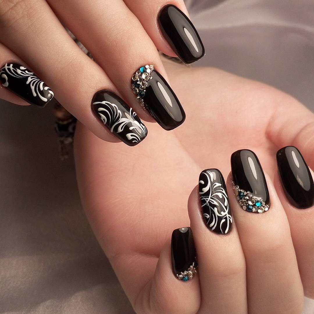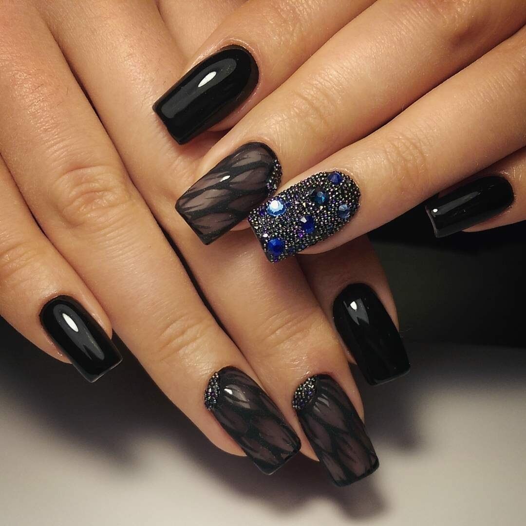 Маникюр чёрный со стразами и блестками