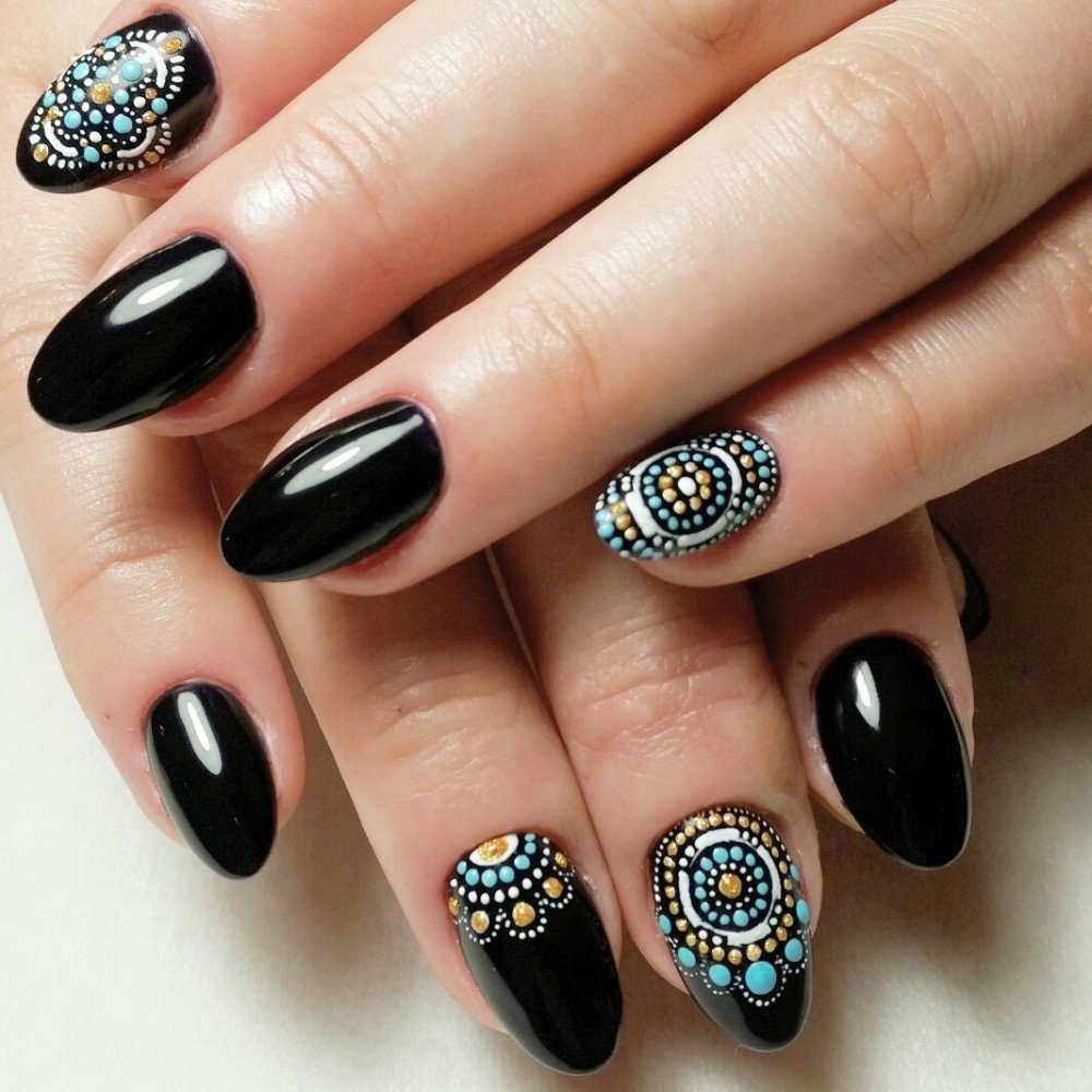 Маникюр на длинные ногти миндалевидной формы с дизайном 2021 черные