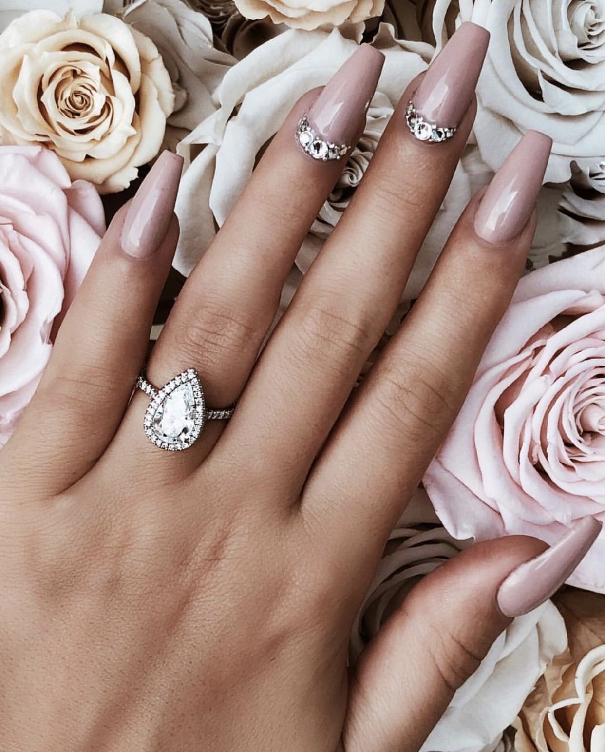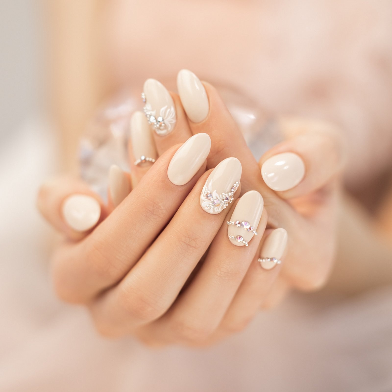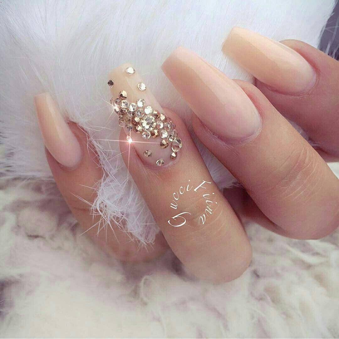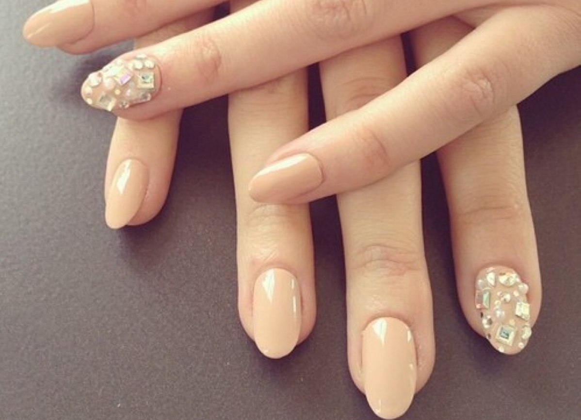 Ногти бежевые с блестками и стразами